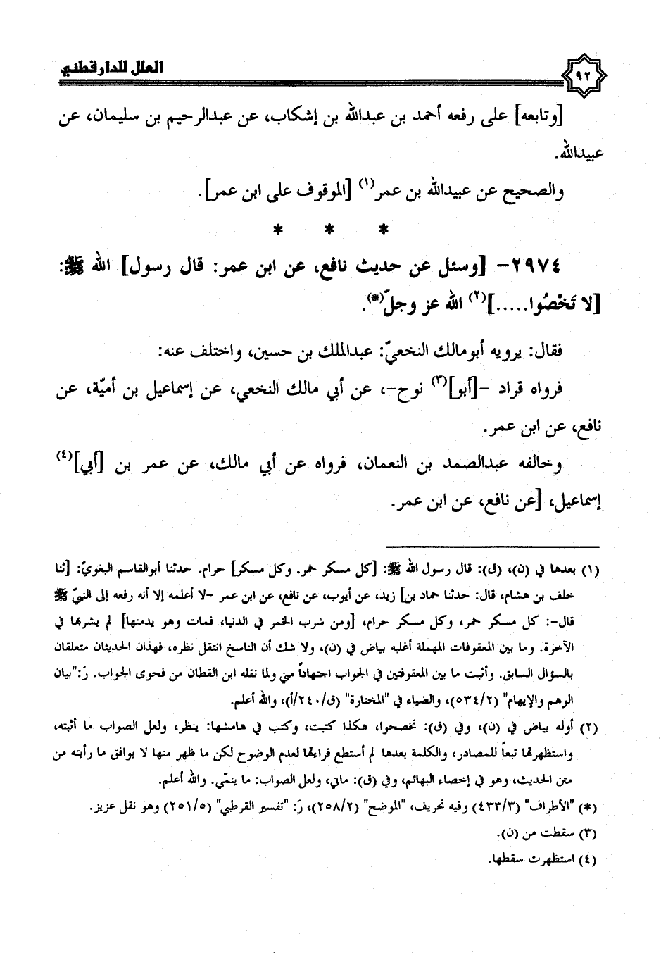 2974- وَسُئِلَ عَنْ حَدِيثِ نَافِعٍ، عَنِ ابْنِ عُمَرَ: قَالَ رَسُولُ اللَّهِ صَلَّى الله عليه وسلم: لا تخصوا ... الله عز وجل.