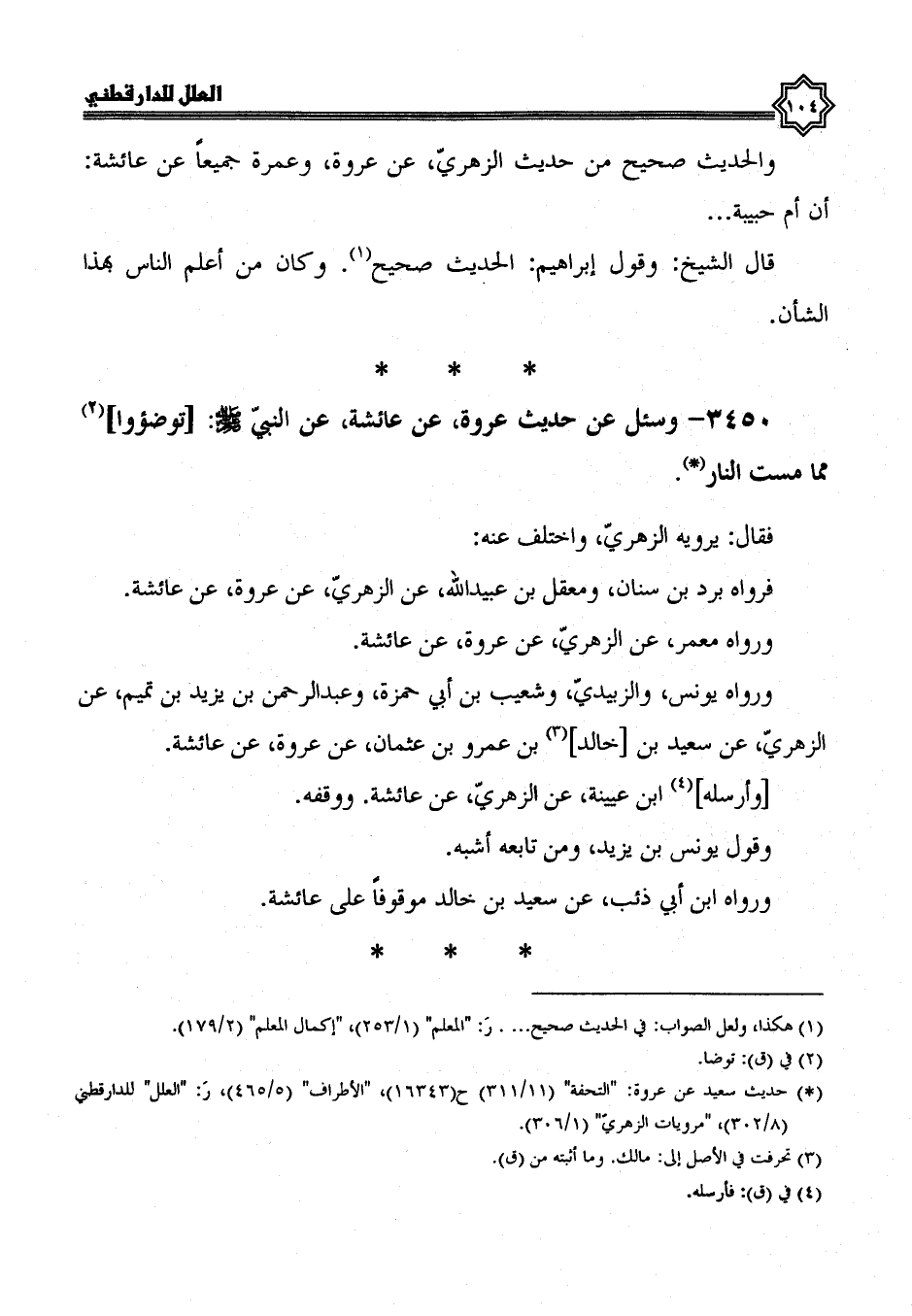 3450- وَسُئِلَ عَنْ حَدِيثِ عُرْوَةَ، عَنْ عَائِشَةَ، عَنْ النَّبِيِّ صَلَّى اللَّهُ عَلَيْهِ وسلم: توضؤوا مما مست النار.