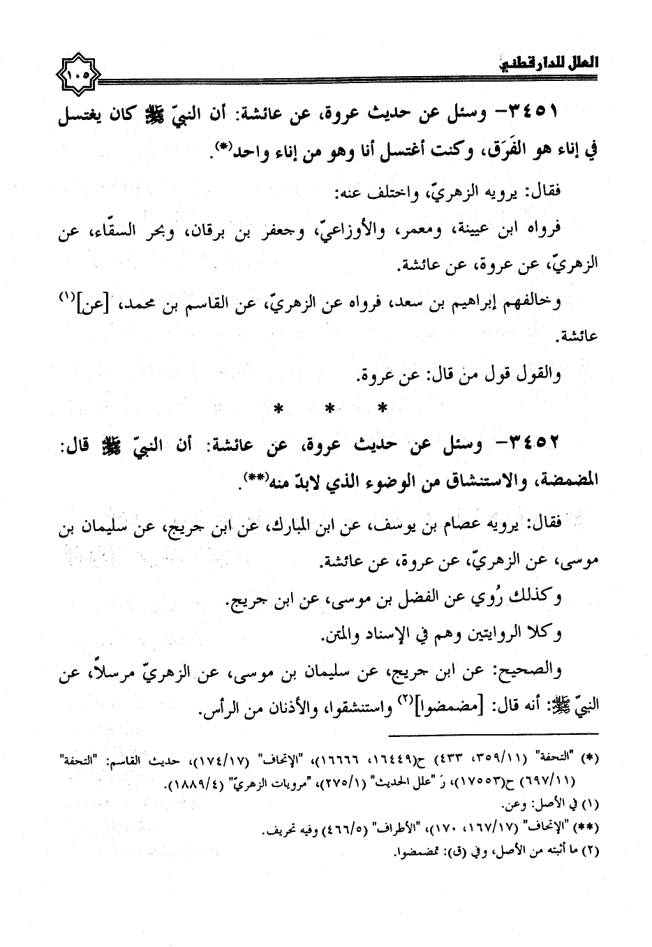 3452- وسئل عن حديث عروة، عن عائشة، أن النبي صلى الله عليه وسلم، قال: المضمضة والاستنشاق من الوضوء الذي لا بد منه.
