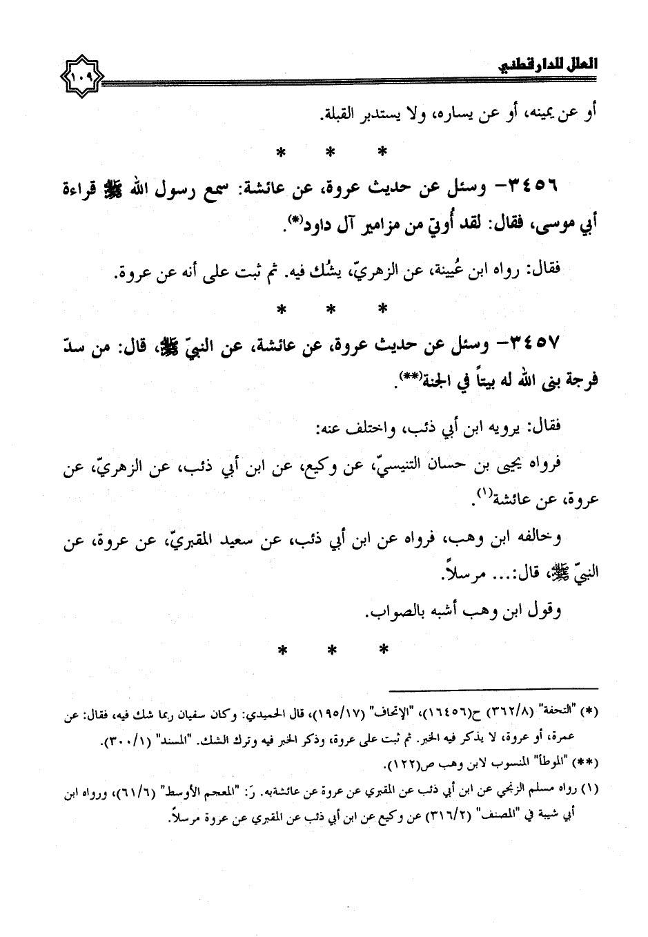 3456- وسئل عن حديث عروة، عن عائشة: سَمِعَ رَسُولَ اللَّهِ صَلَّى اللَّهُ عَلَيْهِ وَسَلَّمَ، قراءة أبي موسى، فقال: لقد أوتي من مزامير آل داود.