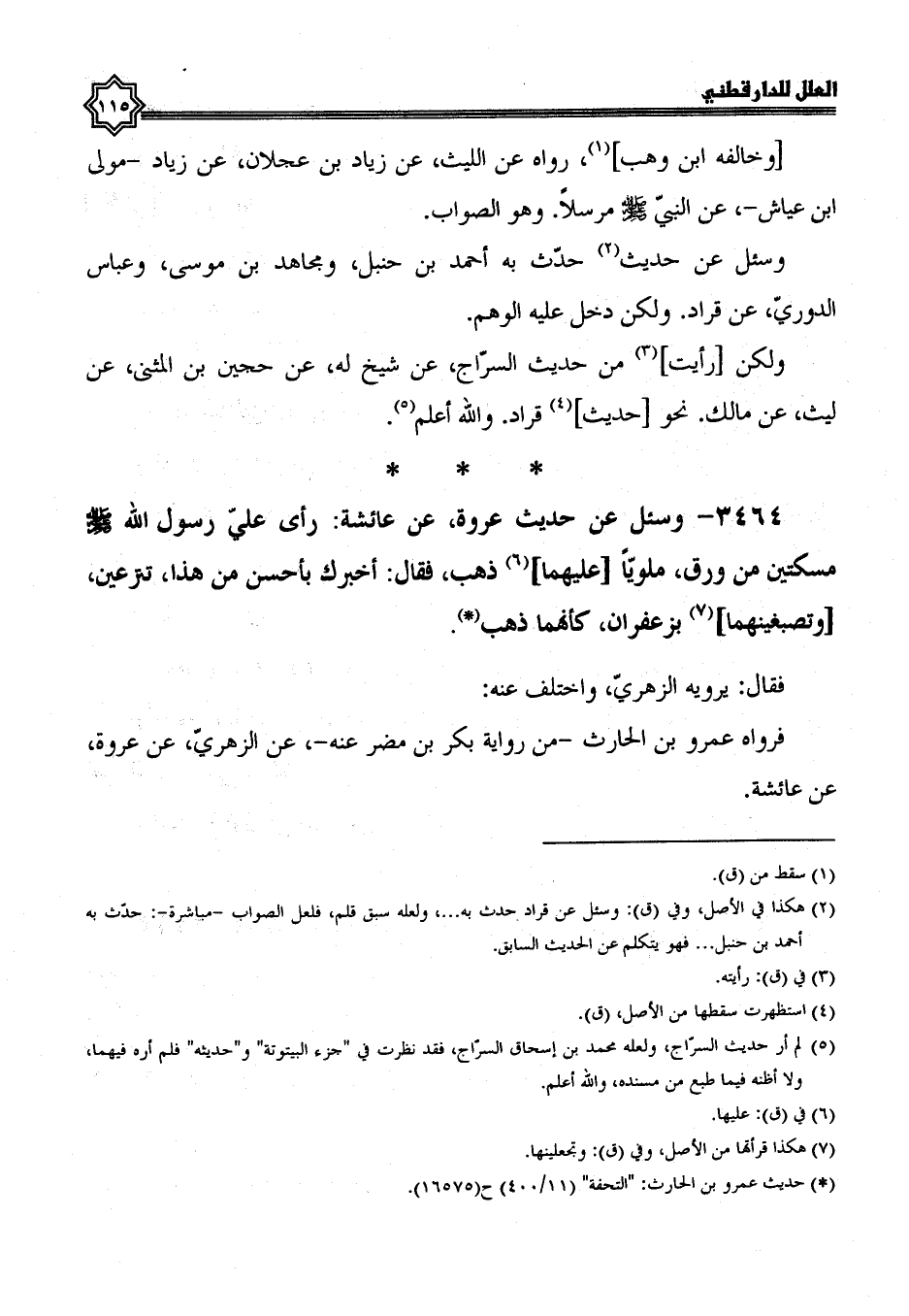 3464- وسئل عن حديث عروة، عن عائشة: رأى عَلَى رَسُولِ اللَّهِ صَلَّى اللَّهُ عَلَيْهِ وَسَلَّمَ مسكتين من ورق ملويا عليهما ذهب، فقال: أخبرك بأحسن من هذا، تنزعين، وتصبغينهما بزعفران كأنهما ذهب.