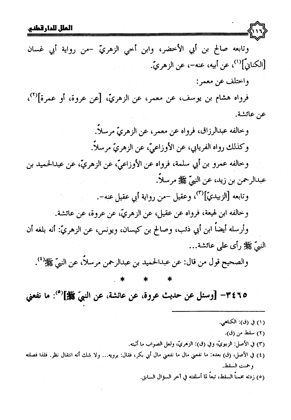 3465- وَسُئِلَ عَنْ حَدِيثِ عُرْوَةَ، عَنْ عَائِشَةَ، عَنْ النَّبِيِّ صَلَّى اللَّهُ عَلَيْهِ وسلم: ما نفعني مال ما نفعني مال أبي بكر.
