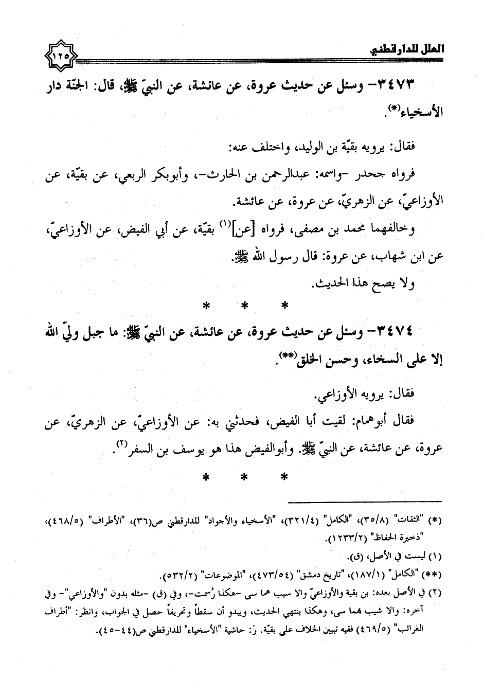 3473- وَسُئِلَ عَنْ حَدِيثِ عُرْوَةَ، عَنْ عَائِشَةَ، عَنْ النَّبِيِّ صَلَّى اللَّهُ عَلَيْهِ وسلم، قال: الجنة دار الأسخياء.