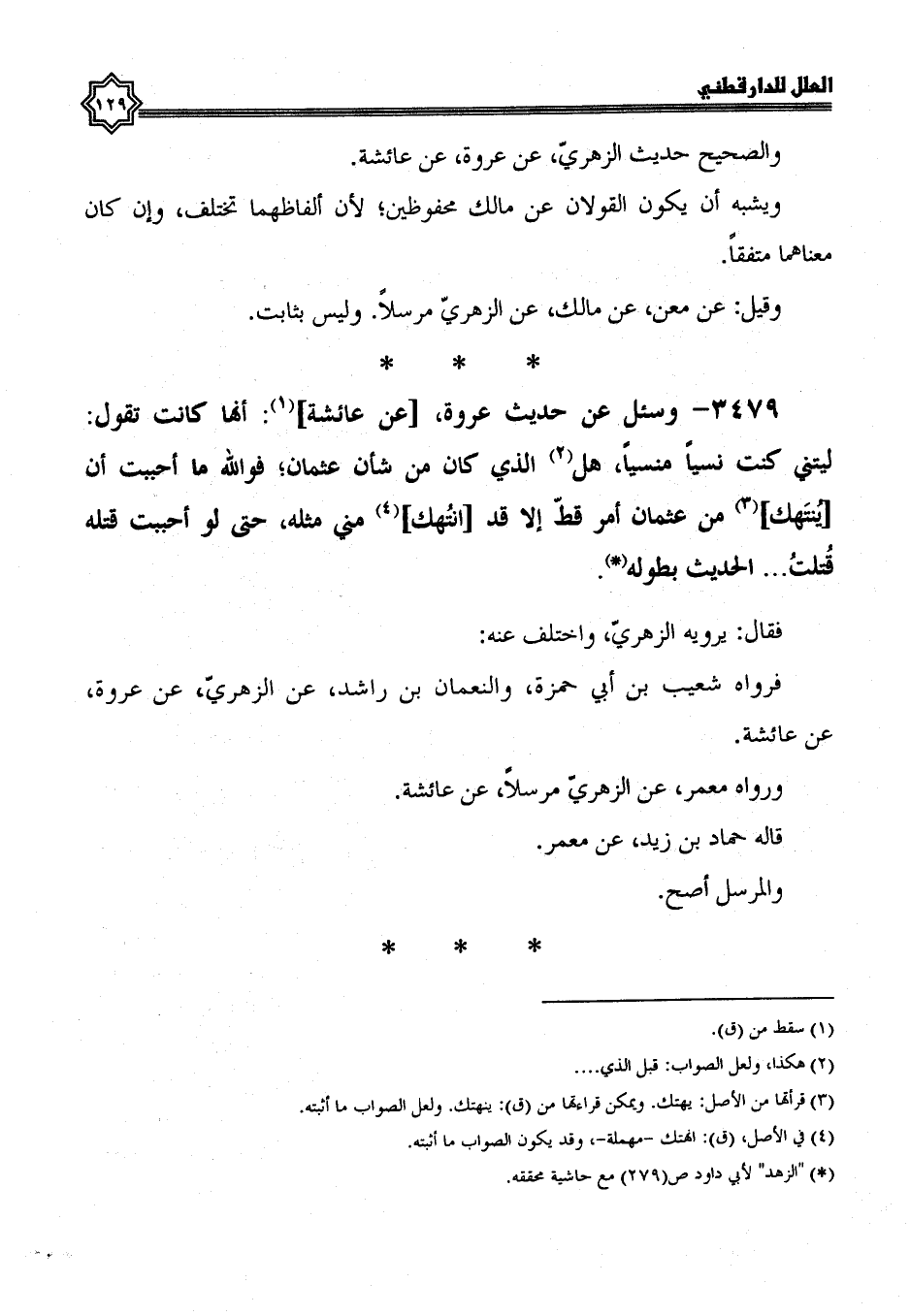 3479- وسئل عن حديث عروة، عن عائشة؛ أنها كانت تقول: ليتني كنت نسيا منسيا، هل الذي كان من شأن عثمان؛ فوالله ما أحببت أن ينتهك من عثمان أمر قط إلا قد انتهك مني مثله، حتى لو أحببت قتله قتلت ... الحديث بطوله.