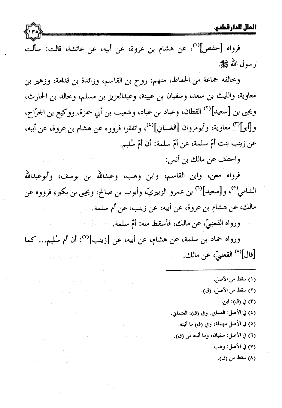 وخالفه جماعة من الحفاظ، منهم: روح بن القاسم، وزائدة بن قدامة، وزهير بن معاوية، والليث بن سعد، وسفيان بن عيينة، وعبد العزيز بن مسلم، وخالد بن الحارث، ويحيى بن سعيد القطان، وعباد بن عباد، وشعيب بن أبي حمزة، ووكيع بن الجراح، وأبو معاوية، وأبو مروان الغساني، واتفقوا فَرَوَوْهُ عَنْ هِشَامِ بْنِ عُرْوَةَ، عَنْ أَبِيهِ، عن زينب بنت أم سلمة، عن أم سلمة؛ أن أم سليم.