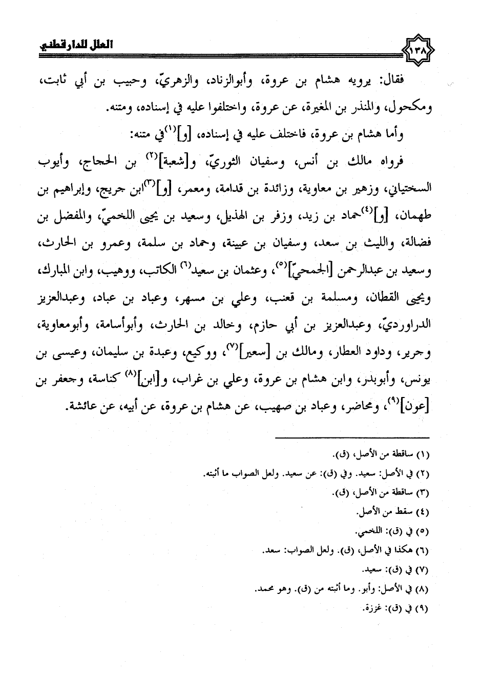 فقال: يرويه هشام بن عروة، وأبو الزناد، والزهري، وحبيب بن أبي ثابت، ومكحول، والمنذر بن المغيرة، عن عروة، واختلفوا عليه في إسناده ومتنه.
