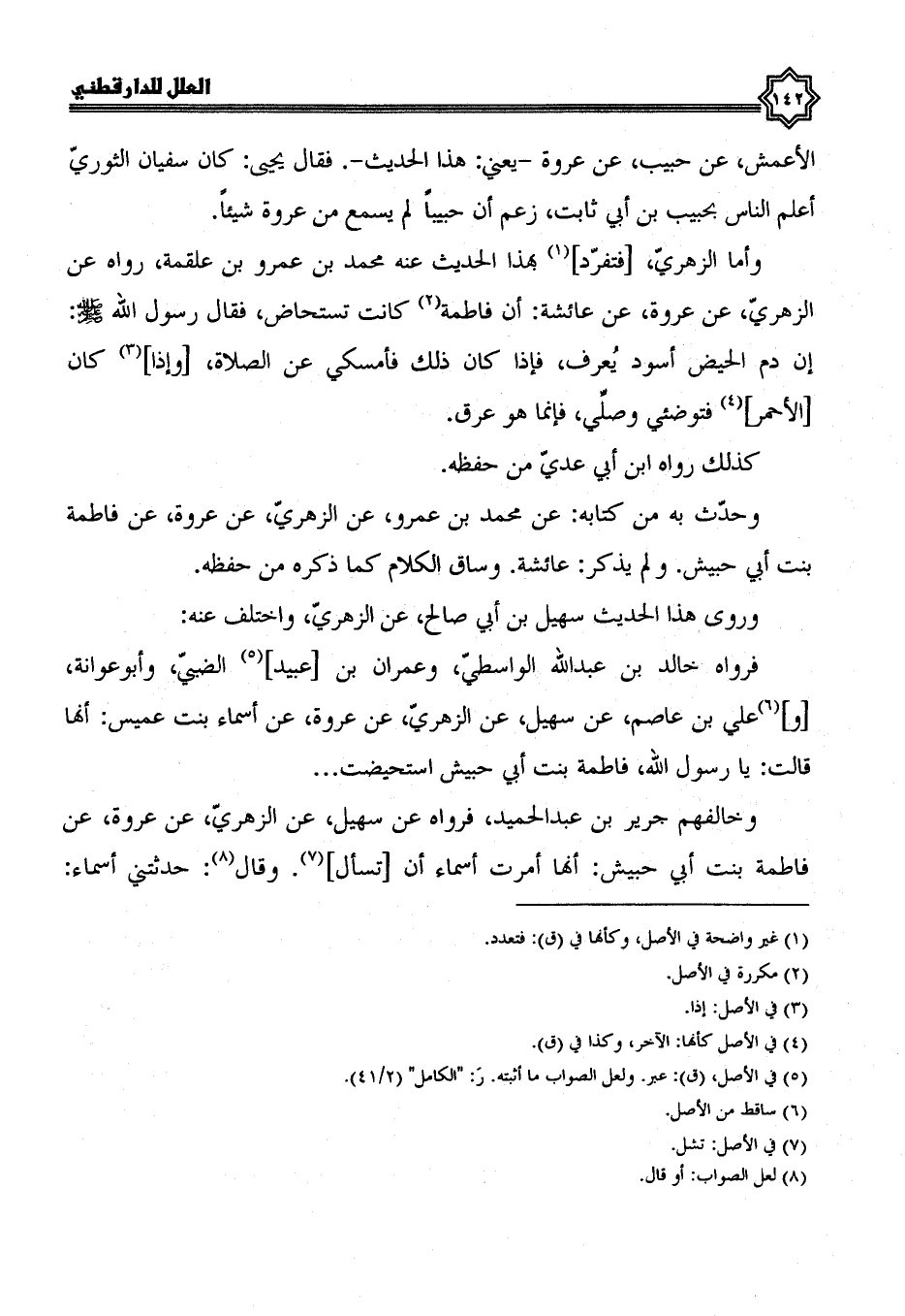 فَرَوَاهُ خَالِدُ بْنُ عَبْدِ اللَّهِ الواسطي، وعمران بن عبيد الضبي، وأبو عوانة، وعلي بن عاصم، عن سهيل، عن الزهري، عن عروة، عن أسماء بنت عميس أنها قالت: يا رسول الله، فاطمة بنت أبي حبيش استحيضت ...