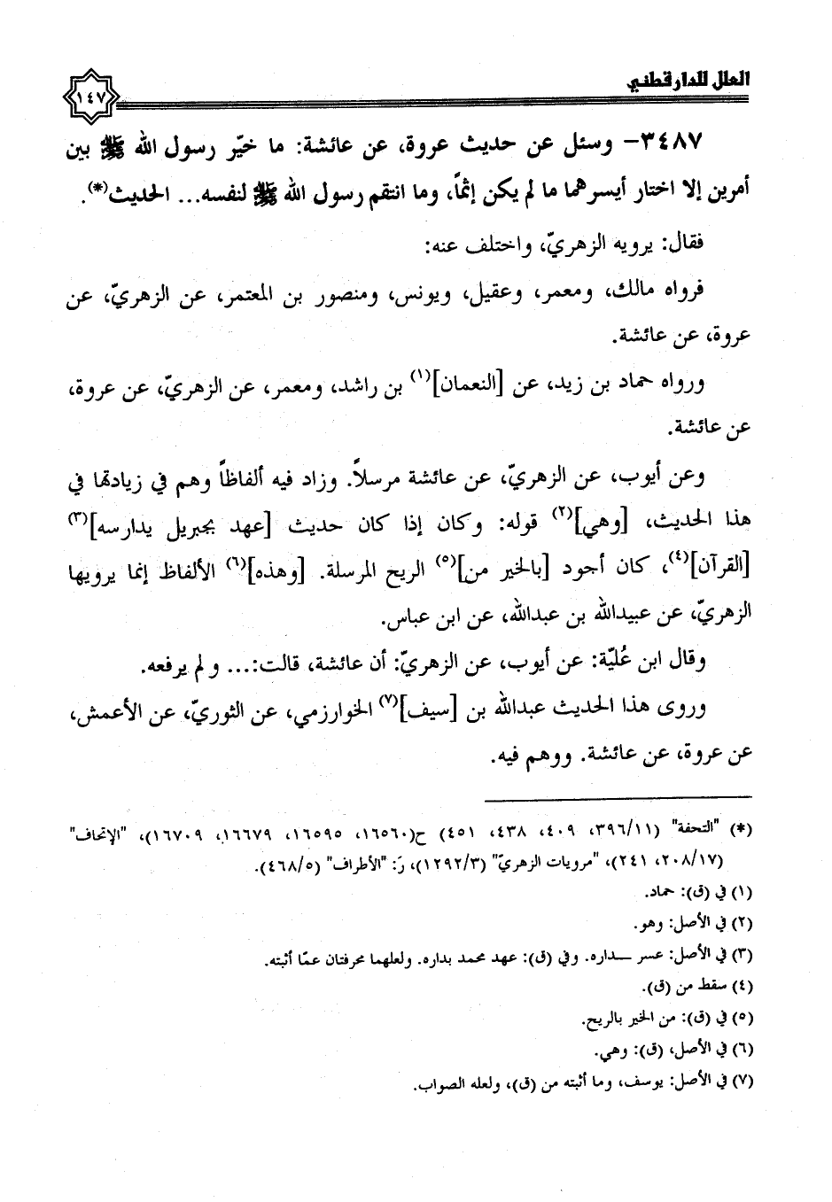 3487- وسئل عن حديث عروة، عن عائشة، ما خير رَسُولُ اللَّهِ صَلَّى اللَّهُ عَلَيْهِ وَسَلَّمَ بَيْنَ أمرين إلا اختار أيسرهما، ما لم يكن إثما، وما انتقم رسول الله صلى الله عليه وسلم لنفسه الْحَدِيثَ.