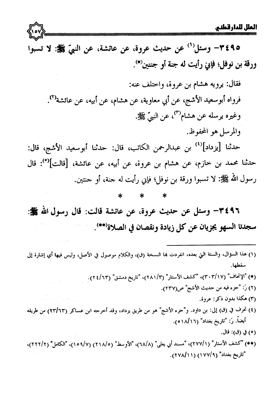 3495- وَسُئِلَ عَنْ حَدِيثِ عُرْوَةَ، عَنْ عَائِشَةَ، عَنْ النَّبِيِّ صَلَّى اللَّهُ عَلَيْهِ وَسَلَّمَ: لَا تَسُبُّوا ورقة بن نوفل؛ فإني رأيت له جنة، أو جنتين.