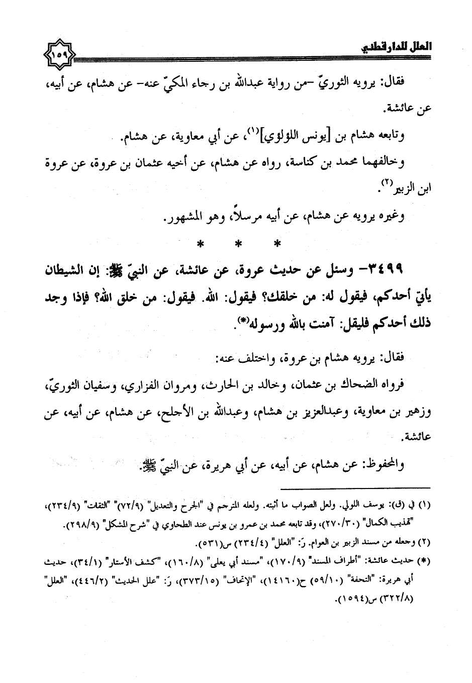 3499- وَسُئِلَ عَنْ حَدِيثِ عُرْوَةَ، عَنْ عَائِشَةَ، عَنْ النَّبِيِّ صَلَّى اللَّهُ عَلَيْهِ وسلم: إن الشيطان يأتي أحدكم، فيقول له: من خلقك؟ فيقول: الله، فيقول: من خلق الله؟ فإذا وجد ذلك أحدكم فليقل: آمنت بالله ورسوله.
