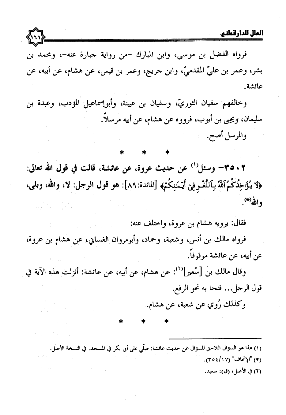 3502- وسئل عن حديث عروة، عن عائشة قالت في قول الله تعالى: {لا يؤاخذكم الله باللغو في أيمانكم} هو قول الرجل لا والله، وبلى والله.