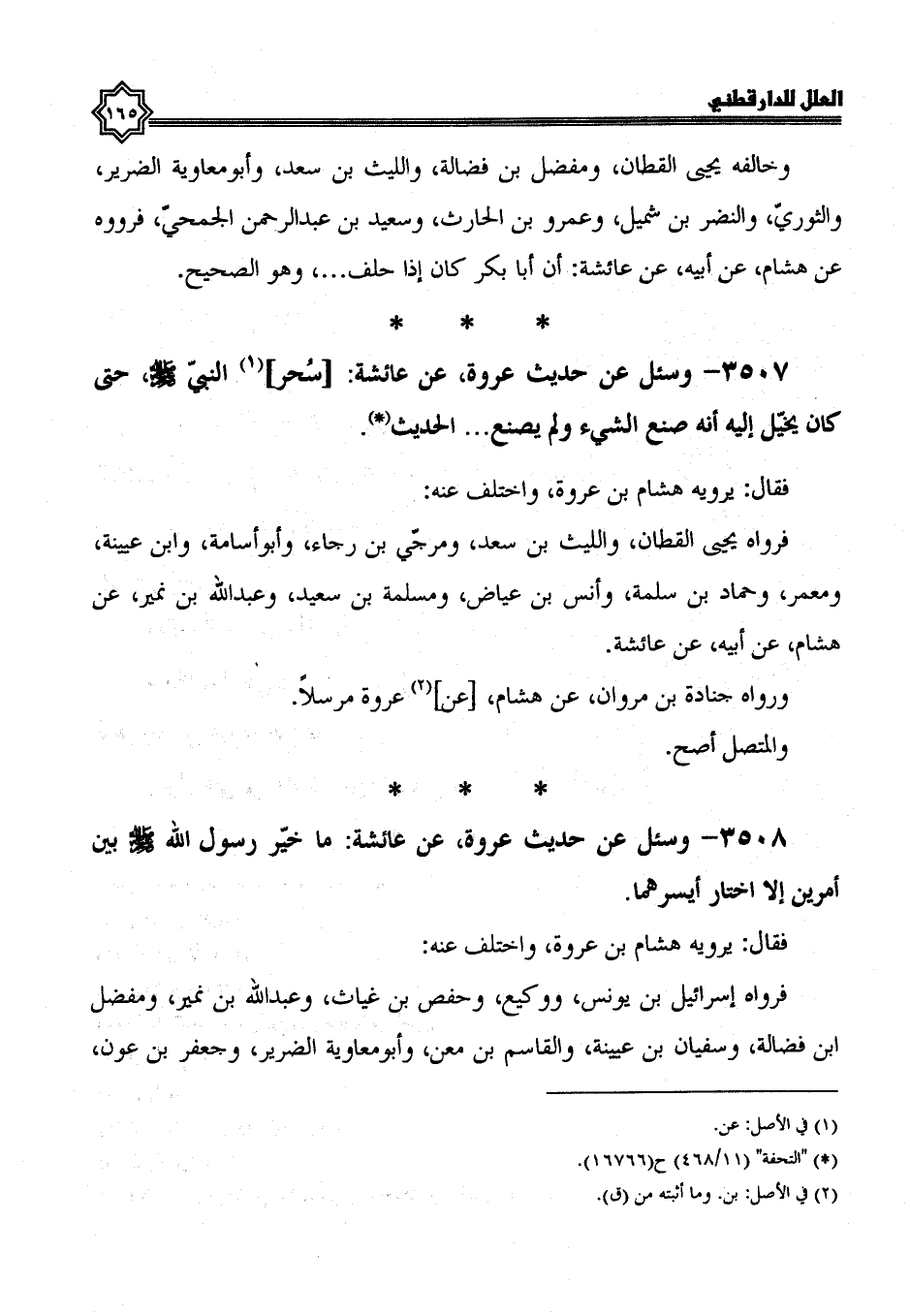 3507- وسئل عن حديث عروة، عن عائشة؛ سحر النبي صلى الله عليه وسلم، حتى كان يخيل إليه أنه صنع الشيء ولم يصنع ... الْحَدِيثَ.