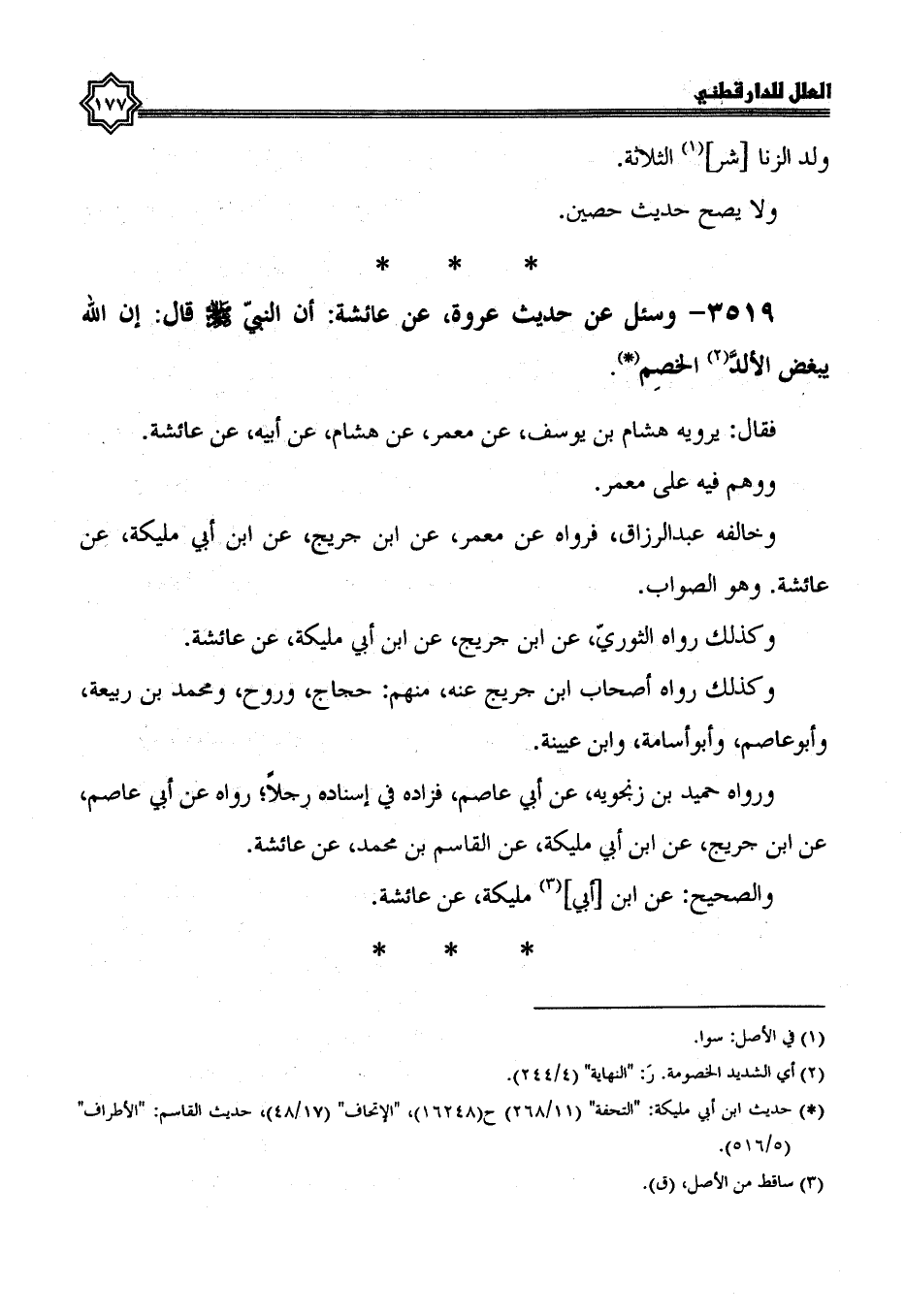 3519- وسئل عن حديث عروة، عن عائشة، أن النبي صلى الله عليه وسلم، قال: إن الله يبغض الألد الخصم.