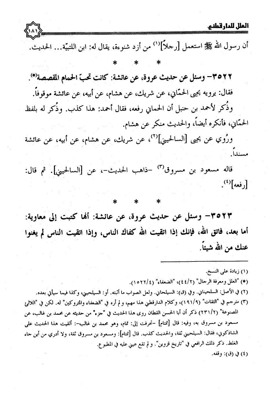 فقال: يرويه يحيى الحماني، عن شريك، عن هشام، عن أبيه، عن عائشة، موقوفا وذكر لأحمد بن حنبل أن الحماني رفعه، فقال أحمد: هذا كذب، وذكر له بلفظ الحماني فأنكره أيضا، والحديث منكر، عن هشام، وروي عن يحيى السالحيني، عن شريك، عن هشام، عن أبيه، عن عائشة، مسندا، قاله: مسعود بن مسروق، ذاهب الحديث، عن السالحيني، ثم قال: رفعه.