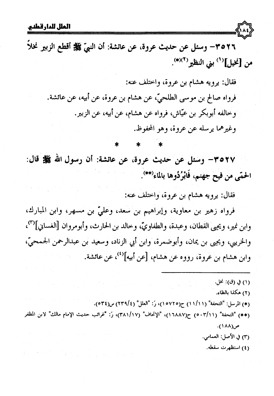 3527- وسئل عن حديث عروة، عن عائشة، أن رسول الله صلى الله عليه وسلم، قال: الحمى من فيح جهنم، فابردوها بالماء.