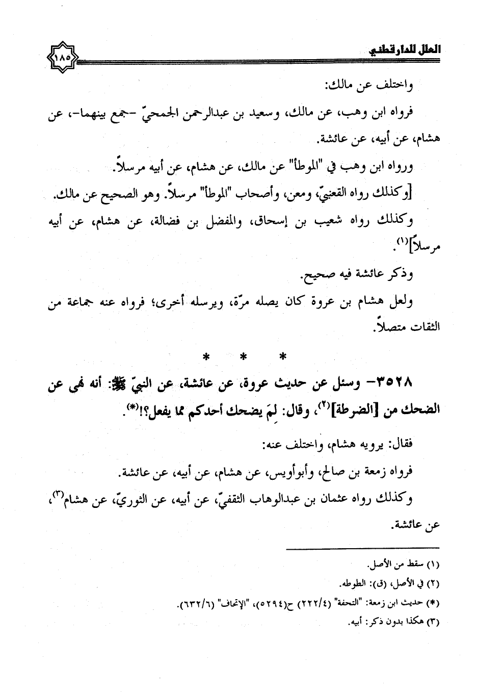 3528- وَسُئِلَ عَنْ حَدِيثِ عُرْوَةَ، عَنْ عَائِشَةَ، عَنْ النَّبِيِّ صَلَّى اللَّهُ عَلَيْهِ وَسَلَّمَ أَنَّهُ نَهَى عن الضحك من الضرطة، وقال: لم يضحك أحدكم مما يفعل.