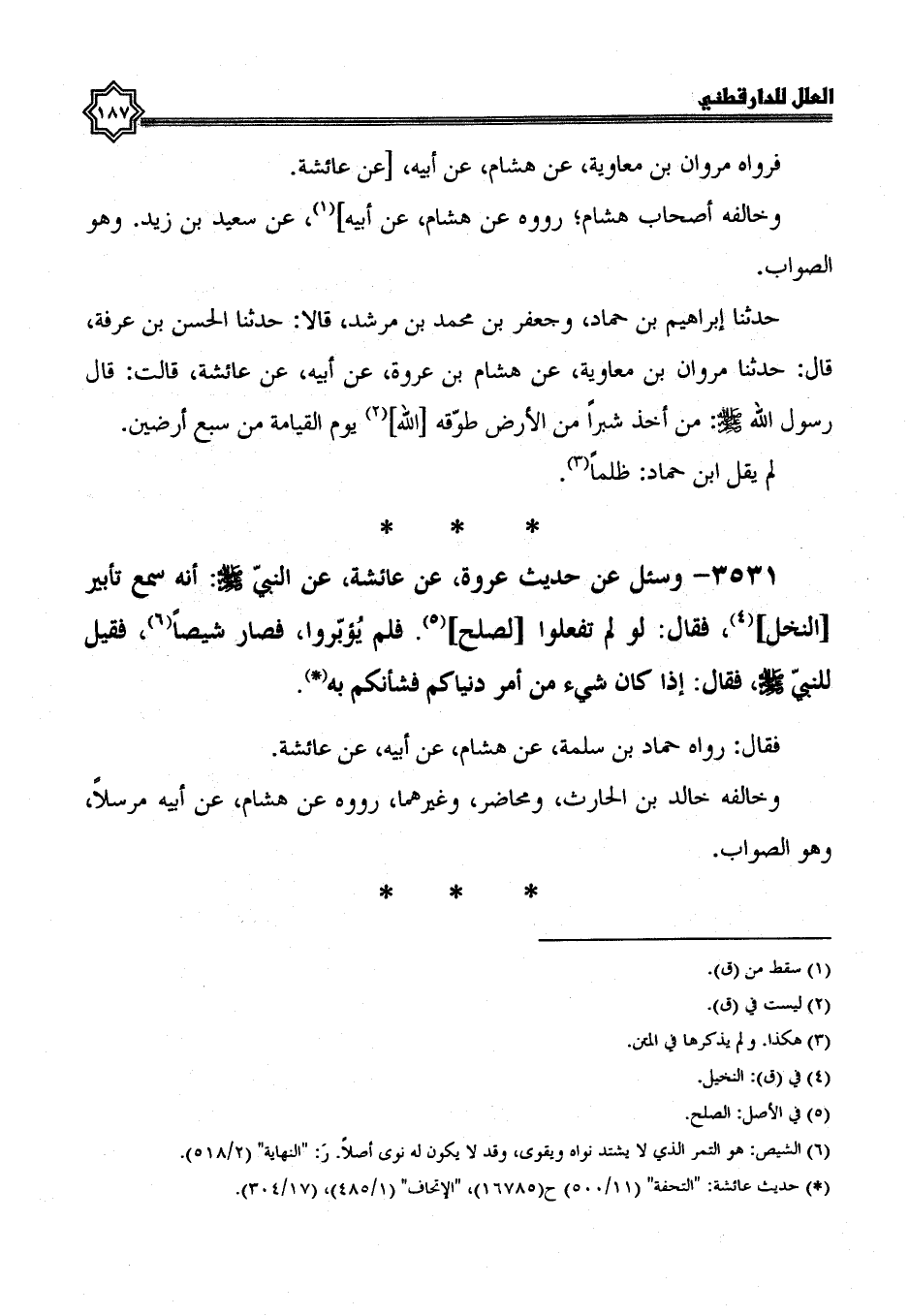 3531- وَسُئِلَ عَنْ حَدِيثِ عُرْوَةَ، عَنْ عَائِشَةَ، عَنْ النَّبِيِّ صَلَّى اللَّهُ عَلَيْهِ وسلم أنه سمع تأبير النخل، فقال: لو لم تفعلوا لصلح فلم يؤبروا، فصار شيصا، فقيل للنبي صلى الله عليه وسلم، فقال: إذا كان شيء من أمر دنياكم فشأنكم به.