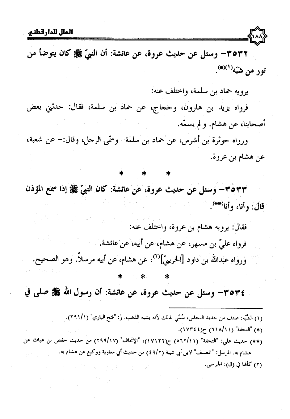 3532- وسئل عن حديث عروة، عن عائشة أن النبي صلى الله عليه وسلم كان يتوضأ من تور من شبه. يَرْوِيهِ حَمَّادُ بْنُ سَلَمَةَ، وَاخْتُلِفَ عَنْهُ؛
