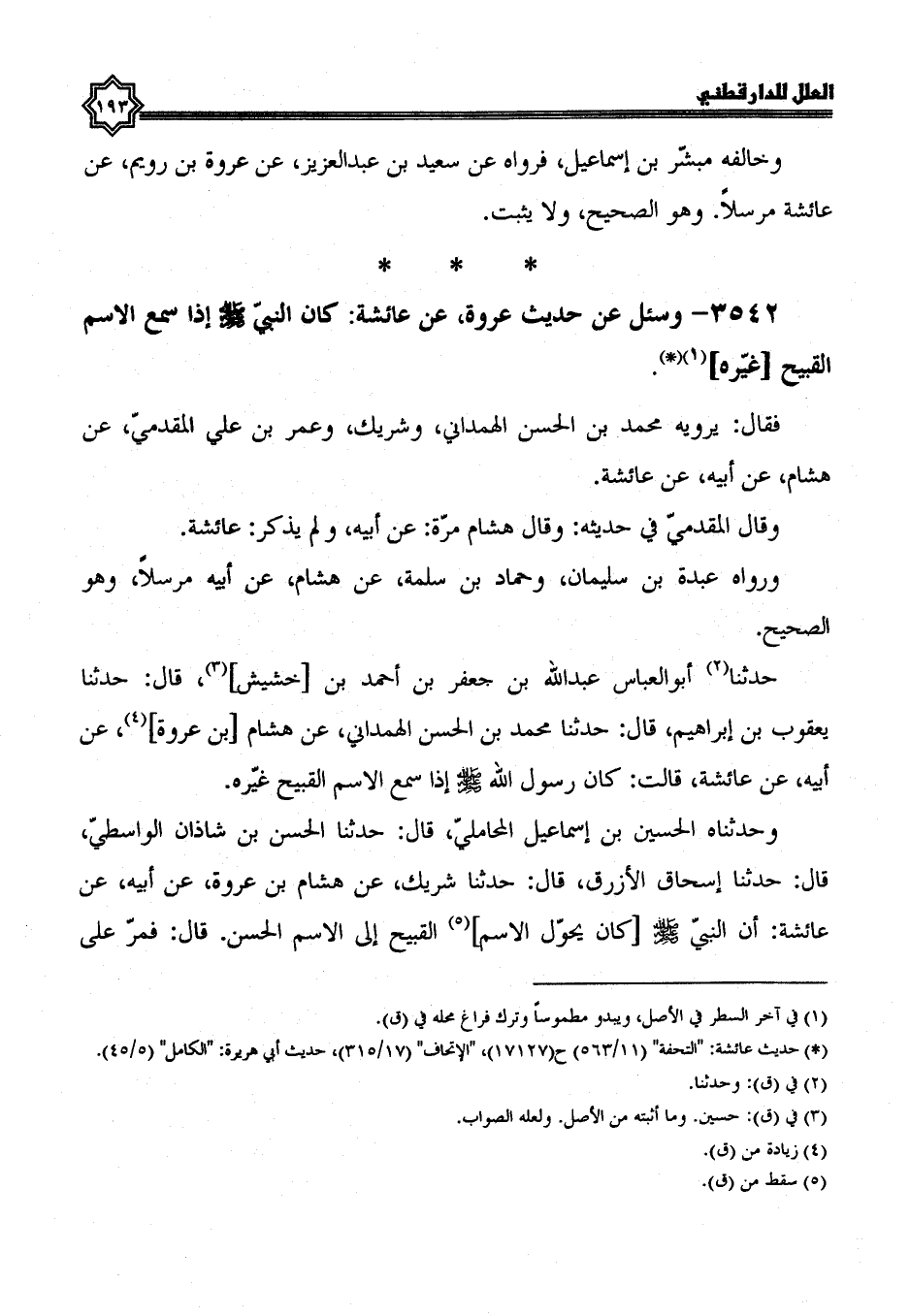 3542- وسئل عن حديث عروة، عن عائشة كَانَ النَّبِيُّ صَلَّى اللَّهُ عَلَيْهِ وَسَلَّمَ إِذَا سمع الاسم القبيح غيره.
