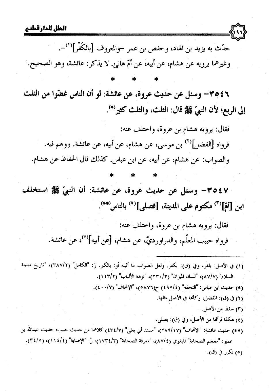 3546- وسئل عن حديث عروة، عن عائشة، لو أن الناس غضوا من الثلث إلى الربع، لأن النبي صلى الله عليه وسلم قال: الثلث والثلث كثير.