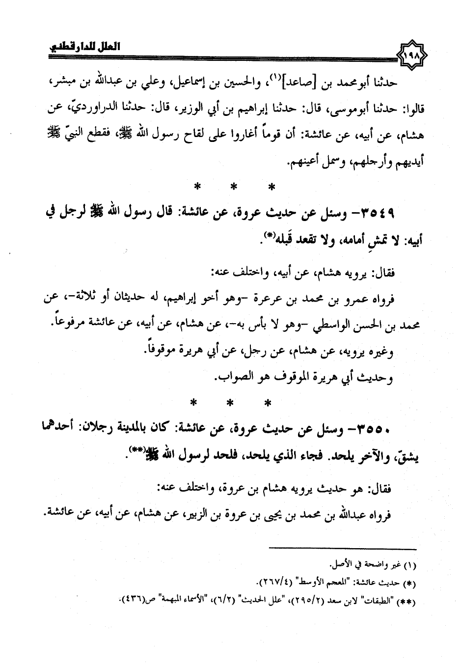 3549- وسئل عن حديث عروة، عن عائشة، قال رسول الله صلى الله عليه وسلم لرجل في أبيه: لا تمش أمامه ولا تقعد قبله.