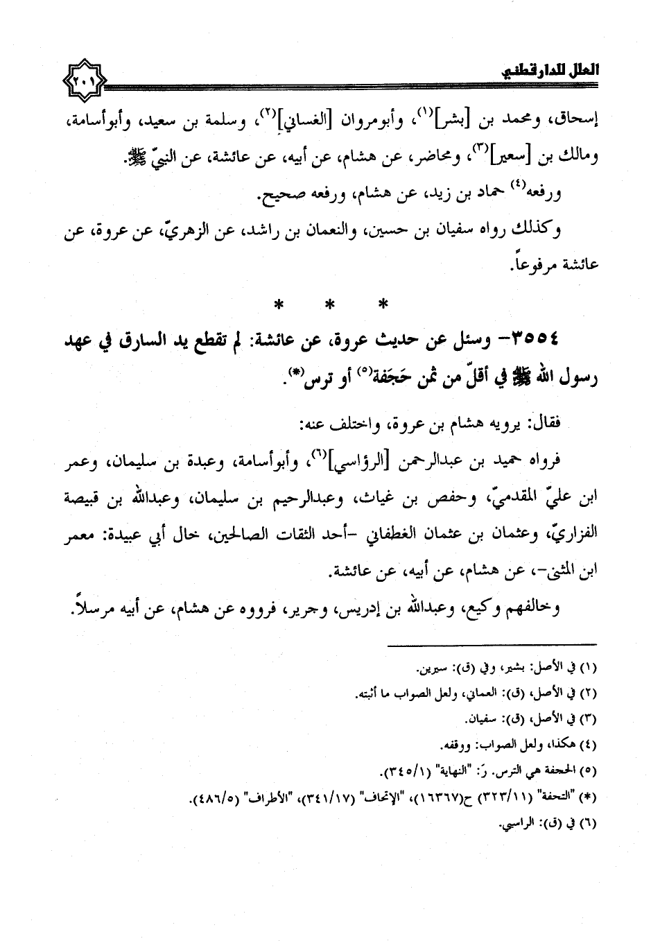 3554- وسئل عن حديث عروة، عن عائشة، لم تقطع يد السارق فِي عَهْدِ رَسُولِ اللَّهِ صَلَّى اللَّهُ عَلَيْهِ وَسَلَّمَ في أقل من ثمن حجفة، أو ترس.