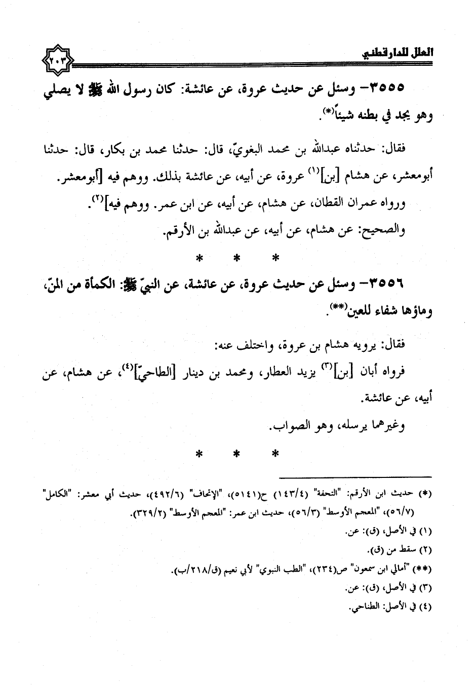 3556- وَسُئِلَ عَنْ حَدِيثِ عُرْوَةَ، عَنْ عَائِشَةَ، عَنْ النَّبِيِّ صَلَّى اللَّهُ عَلَيْهِ وَسَلَّمَ الْكَمْأَةُ مِنَ الْمَنِّ، وَمَاؤُهَا شِفَاءٌ لِلْعَيْنِ.