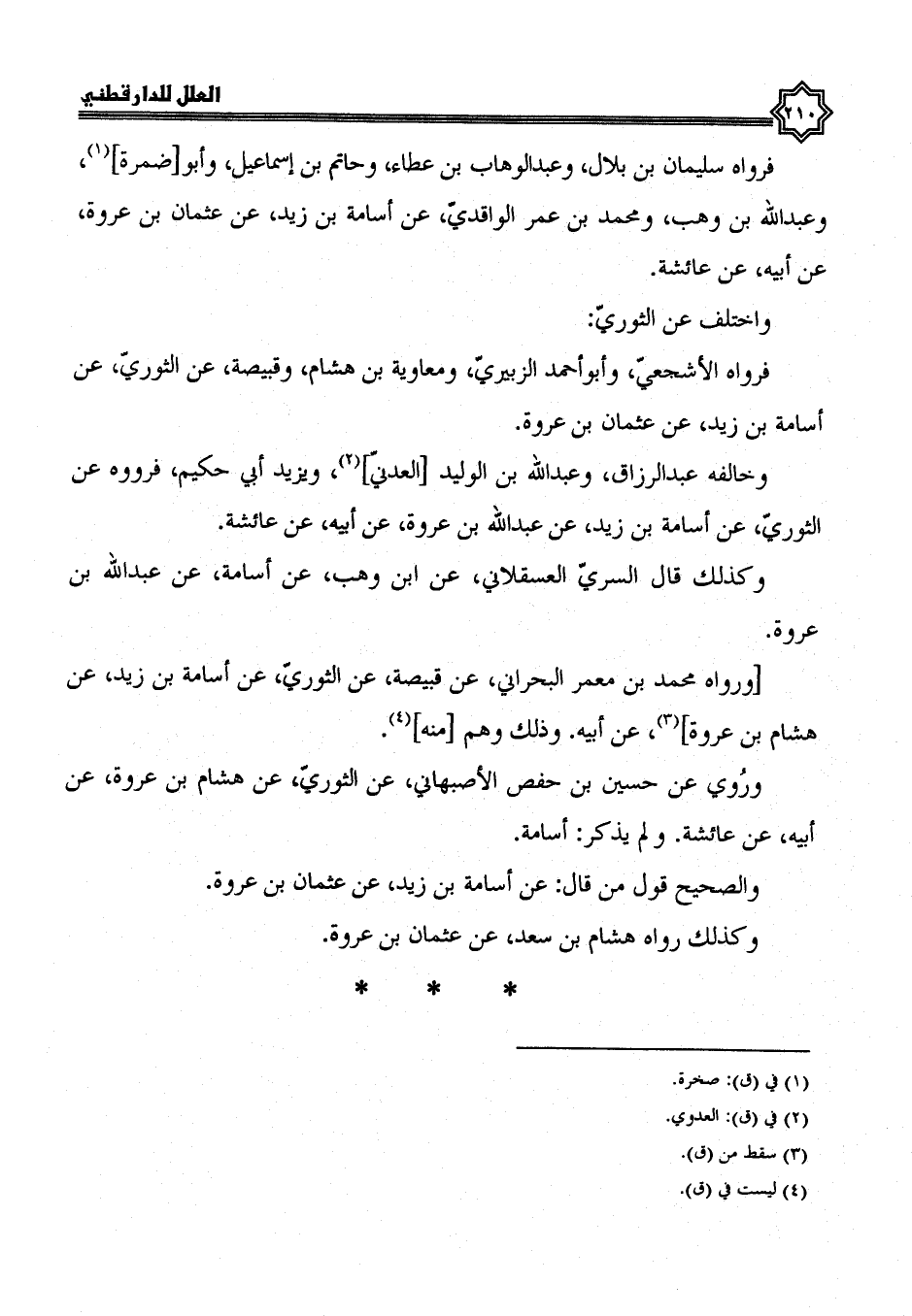 فرواه سليمان بن بلال، وعبد الوهاب بن عطاء، وحاتم بن إسماعيل، وأبو ضمرة، وعبد الله بن وهب، ومحمد بن عمر الواقدي، عن أسامة بن زيد، عن عثمان بن عروة، عن أبيه، عن عائشة واختلف عن الثوري؛