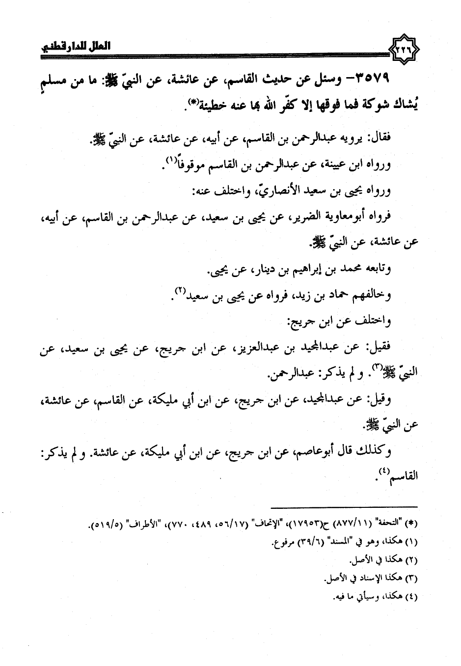 3579- وسئل عن حديث الْقَاسِمِ، عَنْ عَائِشَةَ، عَنِ النَّبِيِّ صَلَّى اللَّهُ عَلَيْهِ وسلم: ما من مسلم يشاك شوكة، فما فوقها إلا كفر الله بها عنه خطيئة.