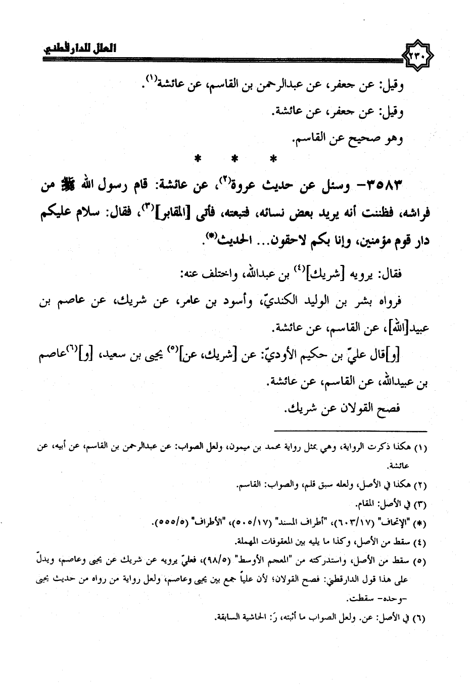 3583- وسئل عن حديث عروة، عن عائشة، قَامَ رَسُولُ اللَّهِ صَلَّى اللَّهُ عَلَيْهِ وَسَلَّمَ من فراشه، فظننت أنه يريد بعض نسائه فتبعته، فأتى المقابر، فقال: سلام عليكم دار قوم مؤمنين، وإنا بكم لاحقون الْحَدِيثَ.
