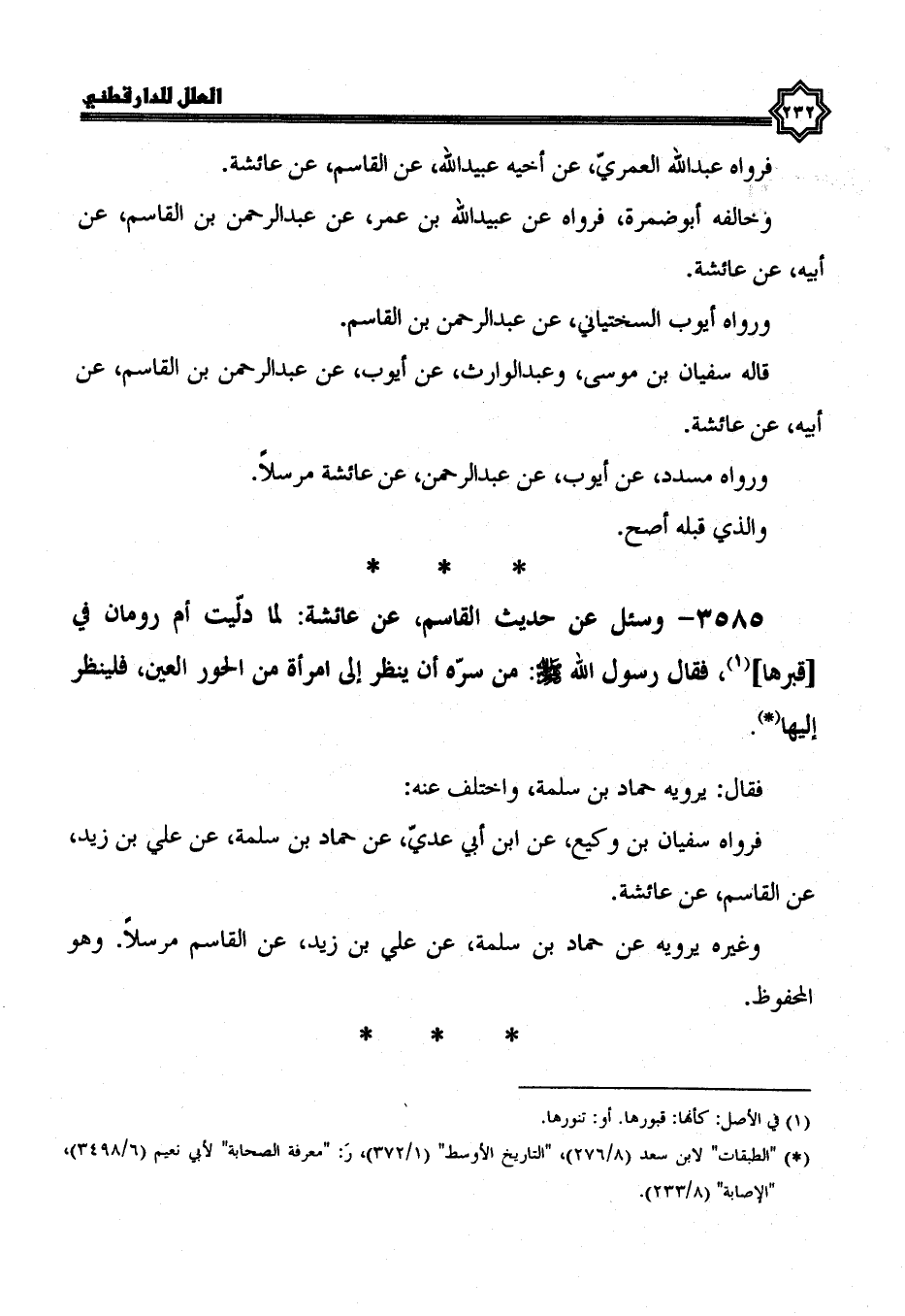 3585- وسئل عن حديث القاسم، عن عائشة، لما دليت أم رومان في قبرها، فَقَالَ رَسُولُ اللَّهِ صَلَّى اللَّهُ عَلَيْهِ وَسَلَّمَ: من سره أن ينظر إلى امرأة من الحور العين فلينظر إليها.