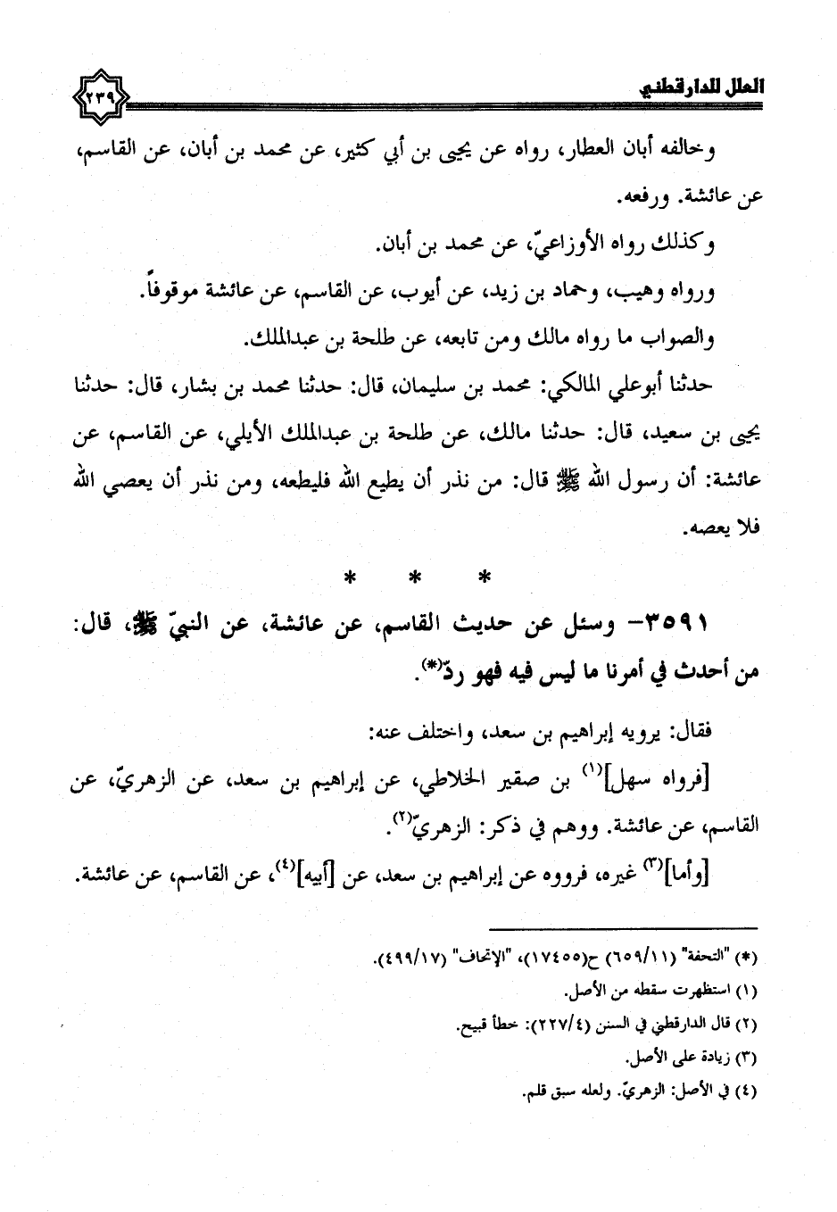 3591- وسئل عن حديث الْقَاسِمِ، عَنْ عَائِشَةَ، عَنِ النَّبِيِّ صَلَّى اللَّهُ عَلَيْهِ وسلم، قال: من أحدث في أمرنا ما ليس فيه، فهو رد.