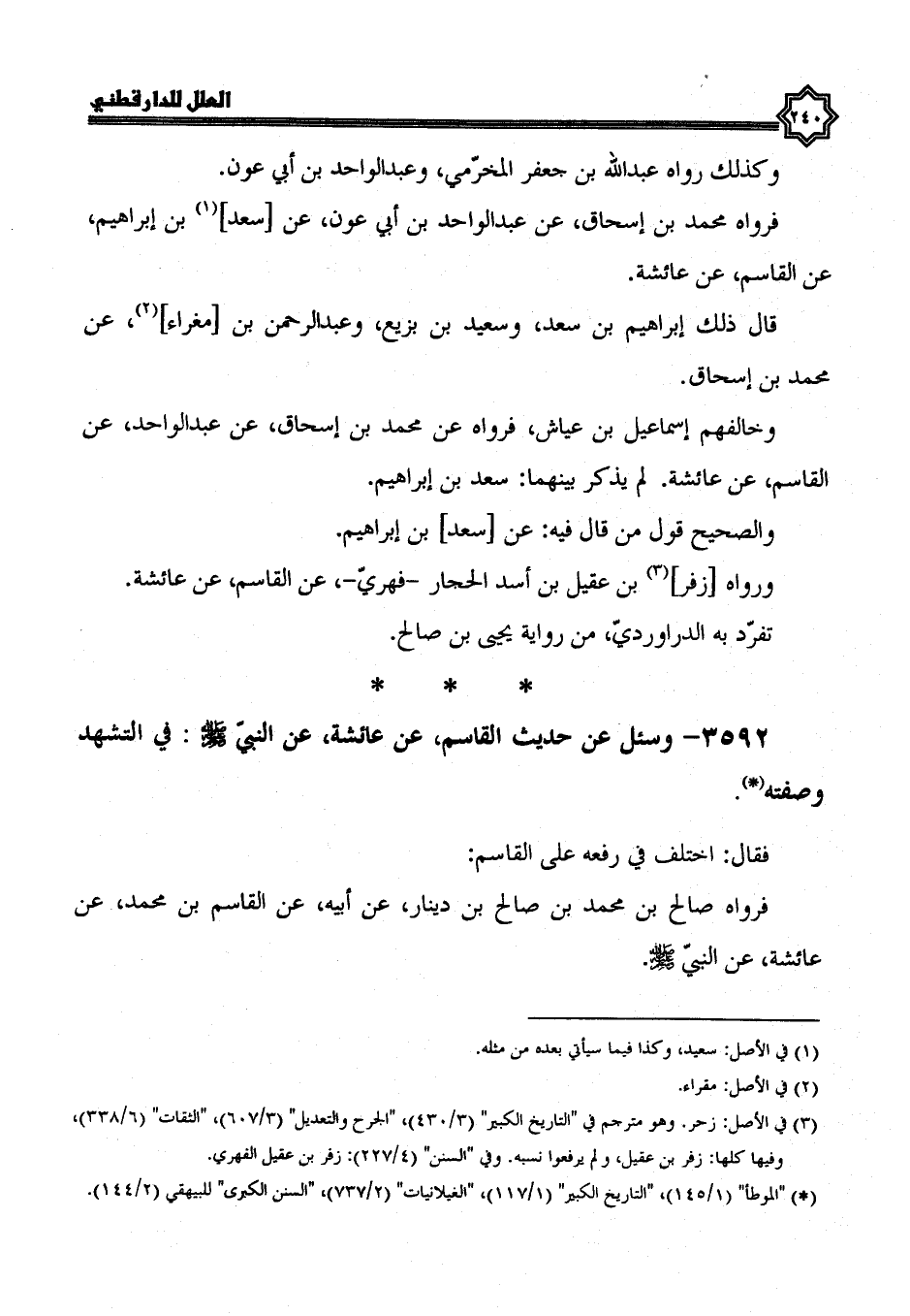 3592- وسئل عن حديث الْقَاسِمِ، عَنْ عَائِشَةَ، عَنِ النَّبِيِّ صَلَّى اللَّهُ عَلَيْهِ وسلم، في التشهد وصفته.