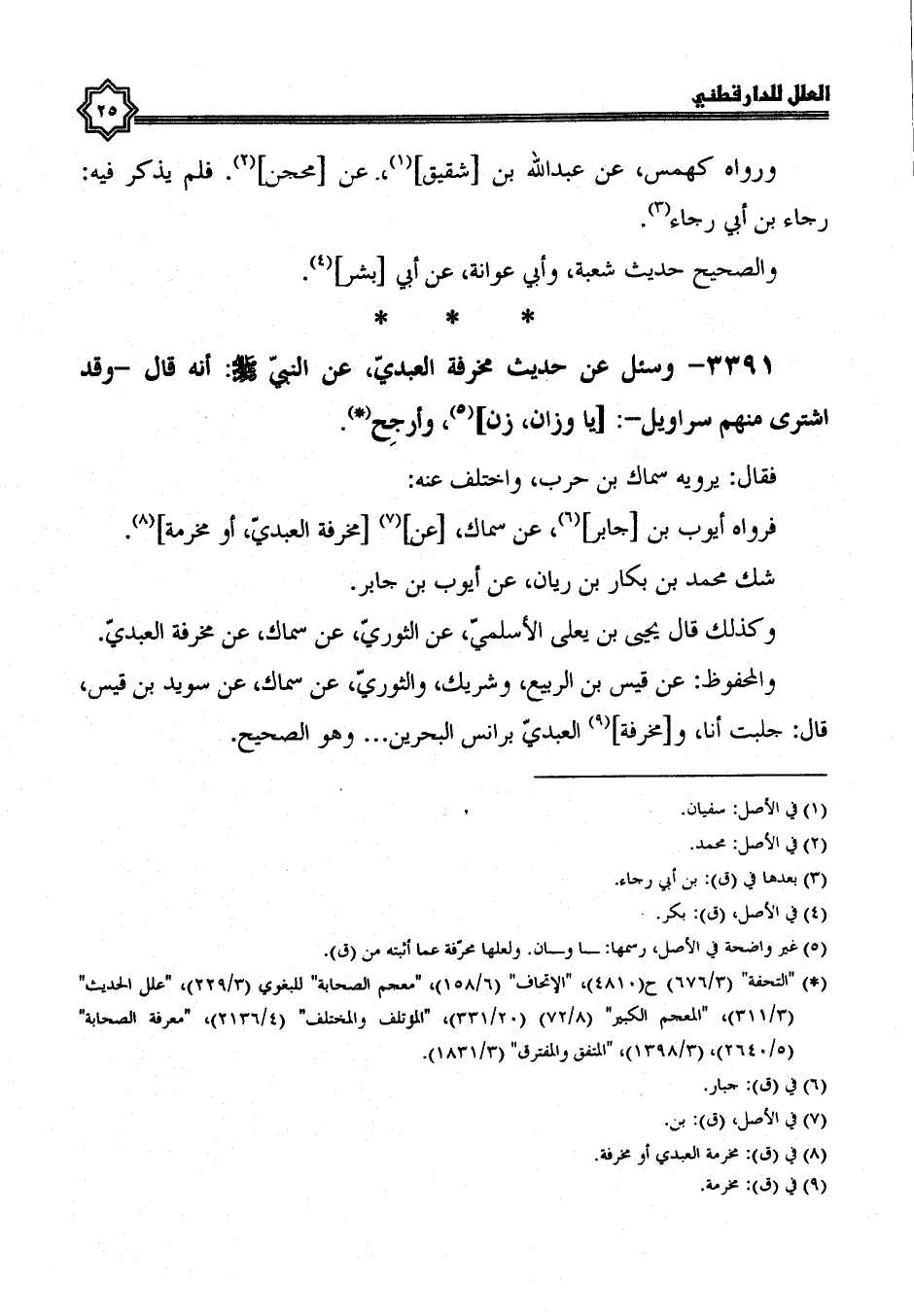 وكذلك قال: يحيى بن يعلى الأسلمي، عن الثوري، عن سماك، عن مخرفة العبدي، والمحفوظ عن قيس بن الربيع، وشريك، والثوري، عن سماك، عن سويد بن قيس، قال: جلبت أنا ومخرفة العبدي برانس البحرين ... وهو الصحيح؛.