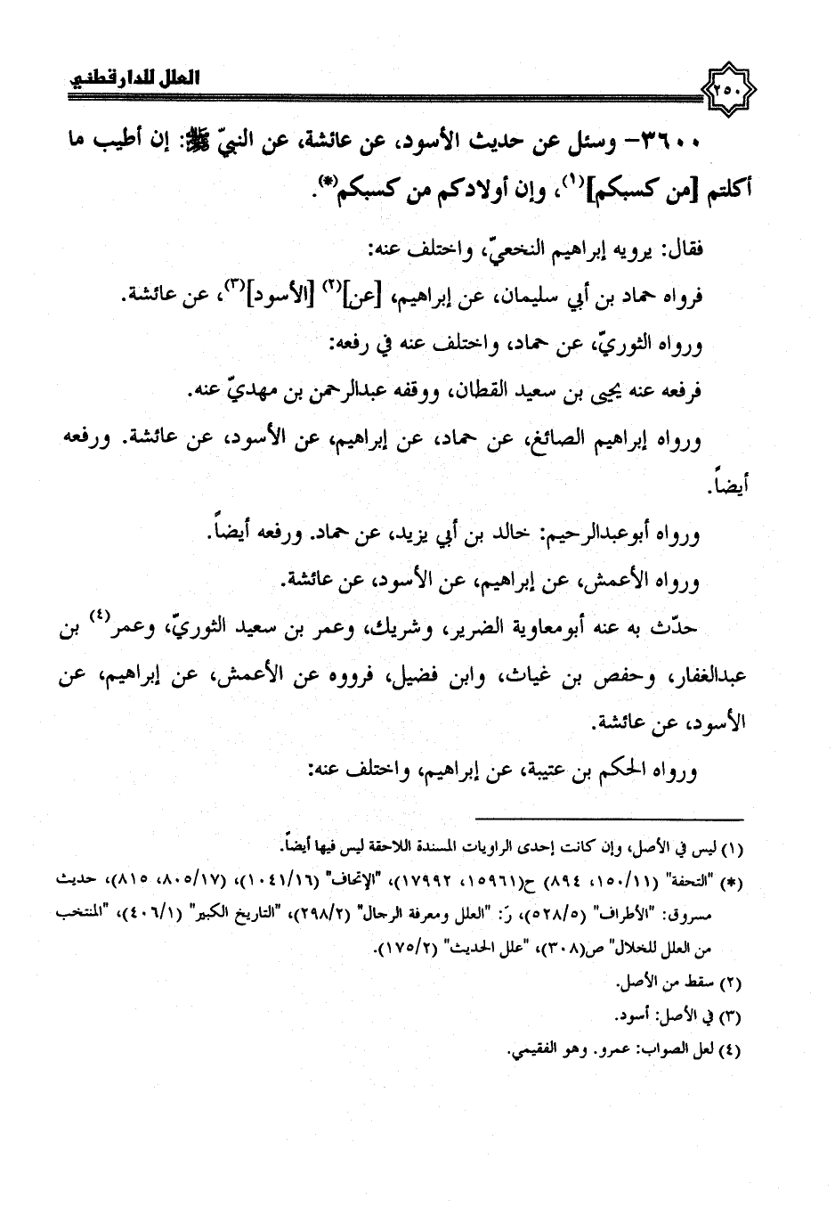 3600- وسئل عن حديث الأسود، عَنْ عَائِشَةَ، عَنِ النَّبِيِّ صَلَّى اللَّهُ عَلَيْهِ وسلم: إن أطيب ما أكلتم من كسبكم، وإن أولادكم من كسبكم.