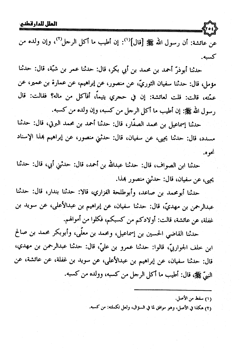 حدثنا إسماعيل بن محمد الصفار، قال: حدثنا أحمد بن محمد البرتي، قال: حدثنا مسدد، قال: حدثنا يحيى، عن سفيان، قال: حدثني منصور، عن إبراهيم، بهذا الإسناد نحوه. حدثنا ابن الصَّوَّافِ، قَالَ: حَدَّثَنَا عَبْدُ اللَّهِ بْنُ أَحْمَدَ، قال: حدثني أبي، قال: حدثنا يحيى، عن سفيان، قال: حدثني منصور بهذا، حدثنا أبو محمد بن صاعد، وأبو طلحة الفزاري، قالا: حدثنا بندار، قال حدثنا عبد الرحمن بن مهدي، قال: حدثنا سفيان، عن إبراهيم بْنَ عَبْدِ الْأَعْلَى، عَنْ سُوَيْدِ بْنِ غَفْلَةَ، عن عائشة، قالت: أولادكم من كسبكم فكلوا من أموالهم.