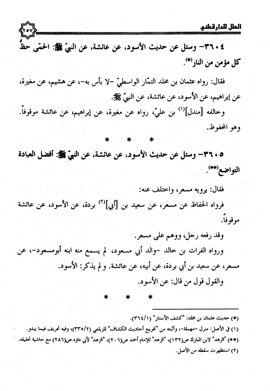 فقال: رواه عثمان بن مخلد التمار الواسطي، لا بأس به، عَنْ هُشَيْمٍ، عَنْ مُغِيرَةَ، عَنْ إِبْرَاهِيمَ، عَنْ الأسود، عَنْ عَائِشَةَ، عَنِ النَّبِيِّ صَلَّى اللَّهُ عَلَيْهِ وسلم، وخالفه مندل بن علي، رواه، عن مغيرة، عن إبراهيم، عن عائشة، موقوفا، وهو المحفوظ.