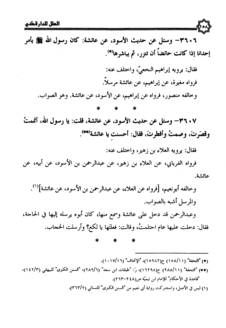 3607- وسئل عن حديث الأسود، عن عائشة، قلت: يا رسول الله أتممت وقصرت، وصمت وأفطرت، فقال: أحسنت يا عائشة.