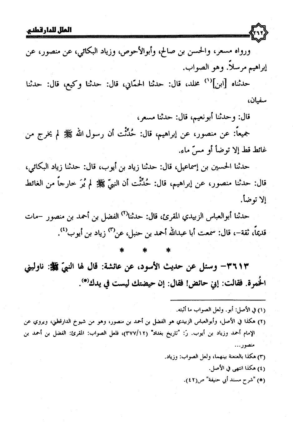 ورواه مسعر، والحسن بن صالح، وأبو الأحوص، وزياد البكائي، عن منصور، عن إبراهيم، مرسلا، وهو الصواب.