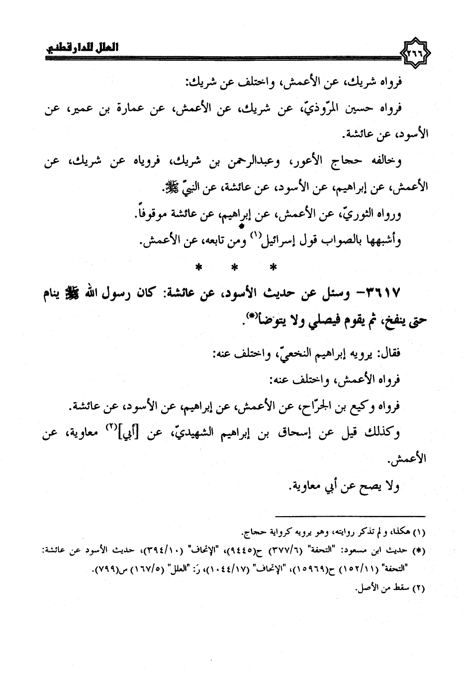 3617- وسئل عن حديث الأسود، عن عائشة، كَانَ رَسُولُ اللَّهِ صَلَّى اللَّهُ عَلَيْهِ وَسَلَّمَ ينام حتى ينفخ، ثم يقوم فيصلي ولا يتوضأ.