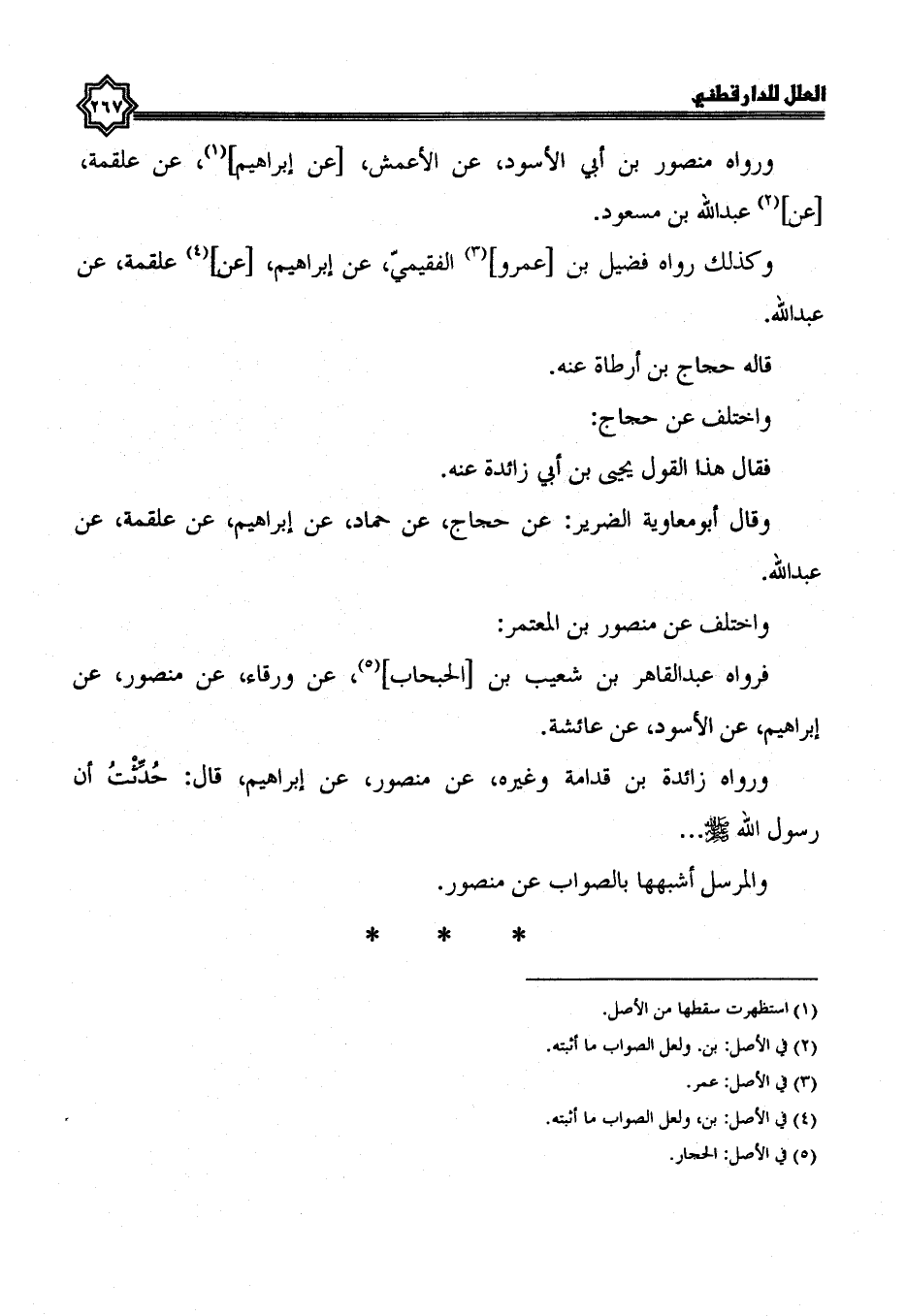 ورواه زائدة بن قدامة، وغيره، عن منصور، عن إبراهيم، قال: حدثت أن رسول الله صلى الله عليه وسلم ... ، والمرسل أشبهها بالصواب عن منصور.