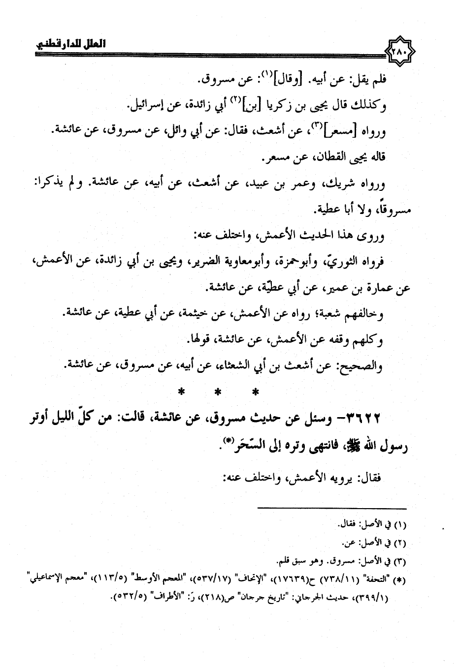 3622- وسئل عن حديث مسروق، عن عائشة قالت: مِنْ كُلِّ اللَّيْلِ أَوْتَرَ رَسُولُ اللَّهِ صَلَّى اللَّهُ عَلَيْهِ وَسَلَّمَ، فانتهى وتره إلى السحر.