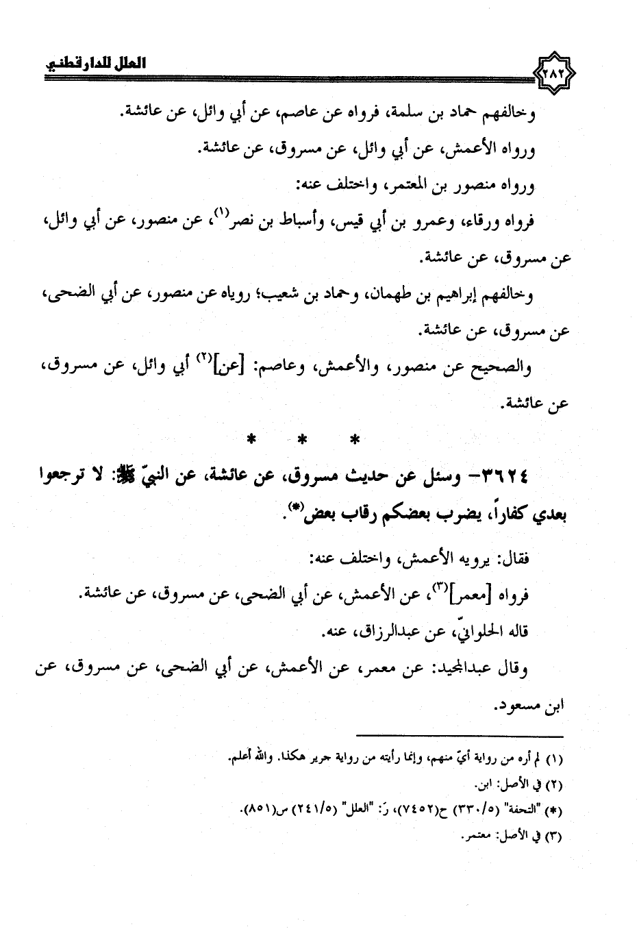 3624- وسئل عن حديث مسروق، عَنْ عَائِشَةَ، عَنِ النَّبِيِّ صَلَّى اللَّهُ عَلَيْهِ وَسَلَّمَ: لَا تَرْجِعُوا بَعْدِي كُفَّارًا يَضْرِبُ بَعْضُكُمْ رقاب بعض.