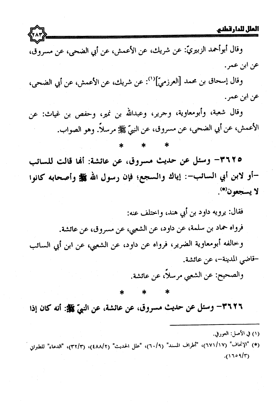 3625- وسئل عن حديث مسروق، عن عائشة، أنها قالت للسائب، أو لابن أبي السائب: إياك والسجع، فَإِنَّ رَسُولَ اللَّهِ صَلَّى اللَّهُ عَلَيْهِ وَسَلَّمَ وأصحابه كانوا لا يسجعون.