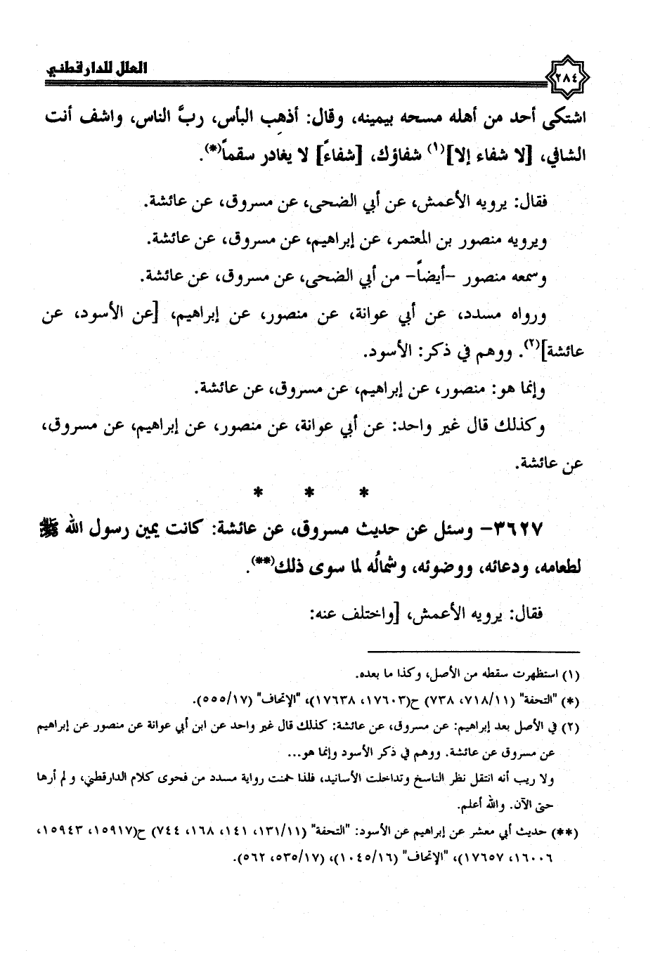 3626- وسئل عن حديث مسروق، عَنْ عَائِشَةَ، عَنِ النَّبِيِّ صَلَّى اللَّهُ عَلَيْهِ وسلم، أنه كان إذا اشتكى أحد من أهله مسحه بيمينه، وقال: أذهب الباس رب الناس، واشف أنت الشافي لا شفاء إلا شفاؤك شفاء لا يغادر سقما.