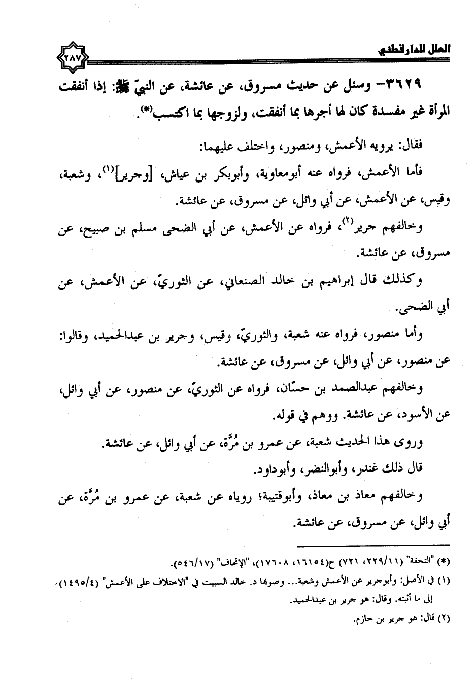 3629- وسئل عن حديث مسروق، عَنْ عَائِشَةَ، عَنِ النَّبِيِّ صَلَّى اللَّهُ عَلَيْهِ وسلم: إذا أنفقت المرأة غير مفسدة كان لها أجرها بما أنفقت، ولزوجها بما اكتسب.