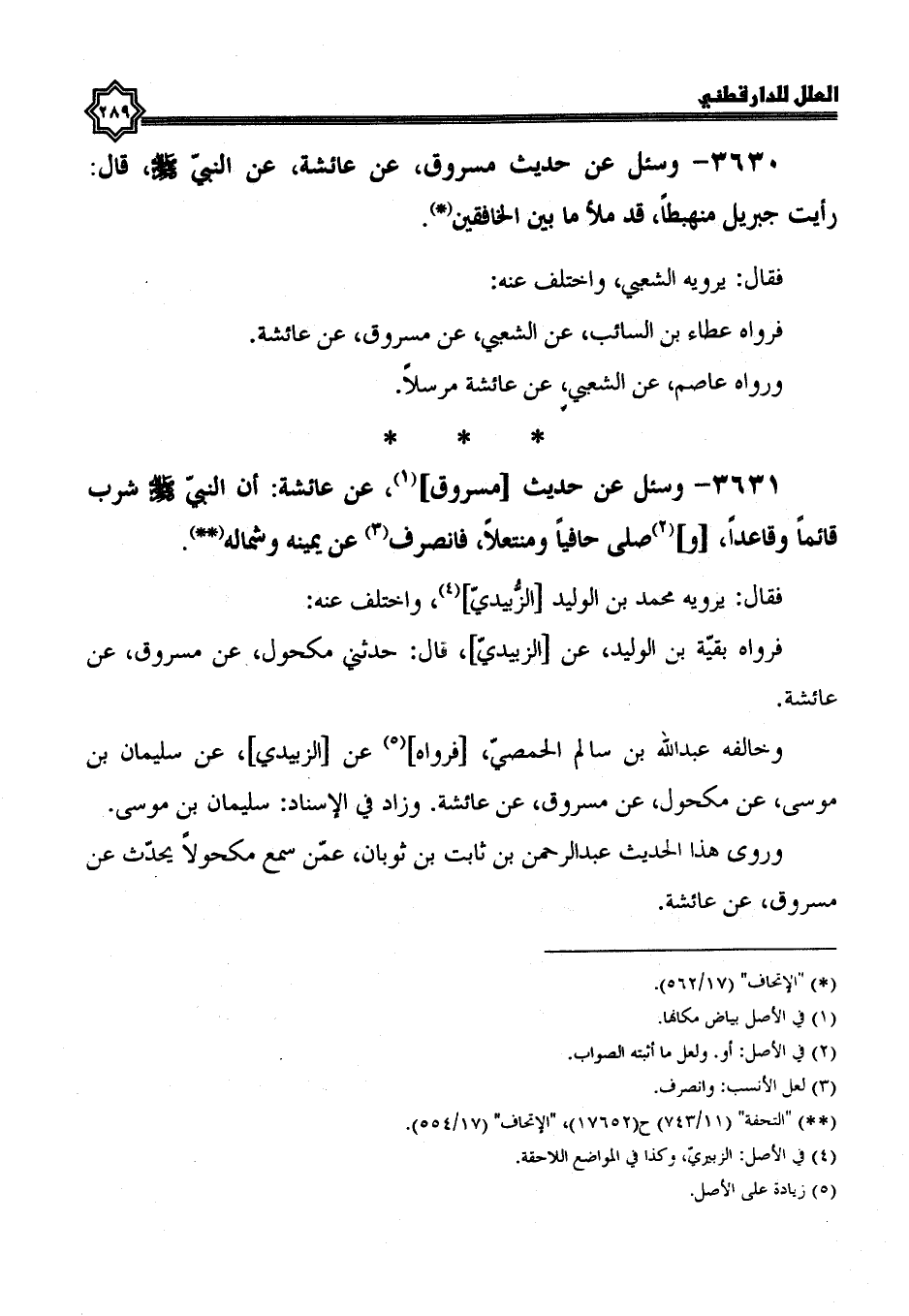 3631- وسئل عن حديث مسروق، عن عائشة، أن النبي صلى الله عليه وسلم شرب قائما وقاعدا، وصلى حافيا ومنتعلا، فانصرف عن يمينه وشماله.