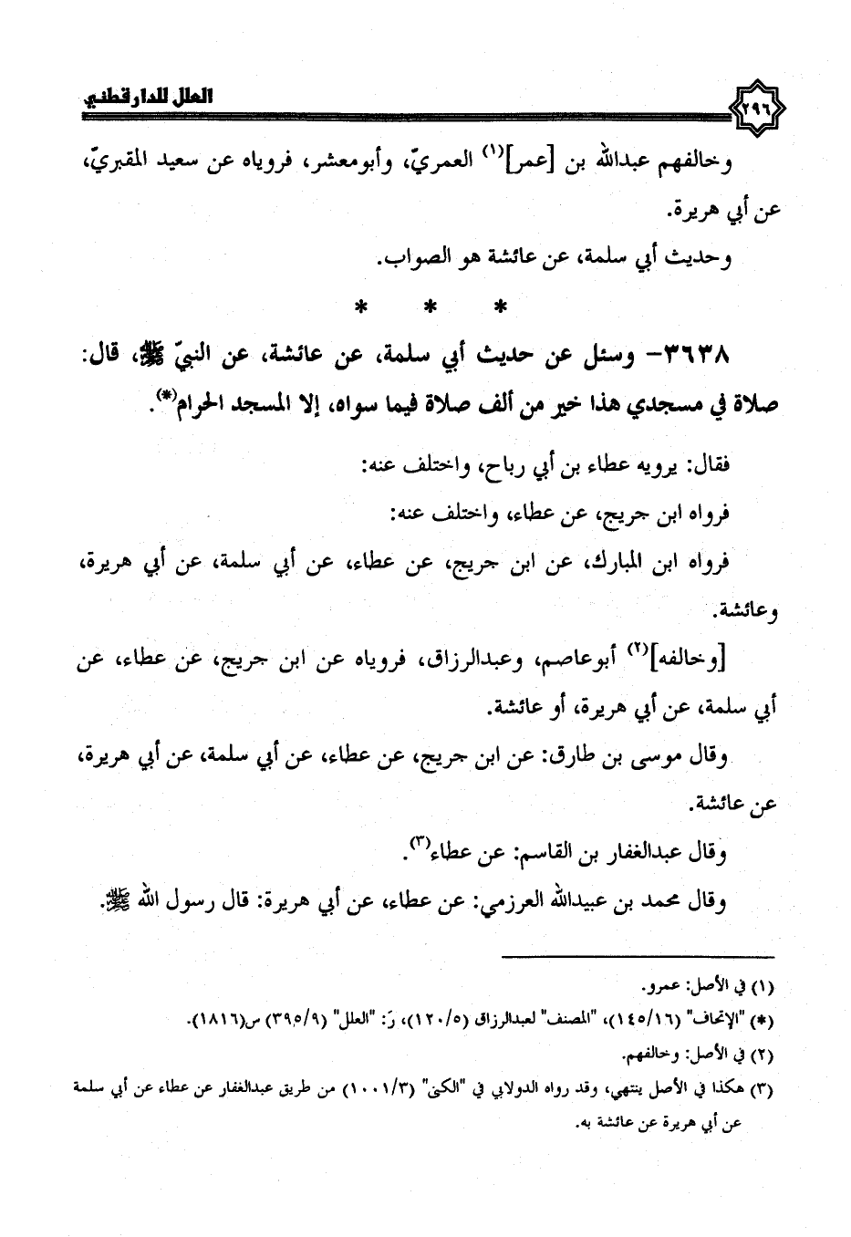 3638- وسئل عن حديث أَبِي سَلَمَةَ، عَنْ عَائِشَةَ، عَنِ النَّبِيِّ صَلَّى اللَّهُ عَلَيْهِ وَسَلَّمَ، قَالَ: صَلَاةٌ فِي مَسْجِدِي هَذَا خَيْرٌ مِنْ أَلْفِ صَلَاةٍ فِيمَا سِوَاهُ إِلَّا الْمَسْجِدَ الحرام.