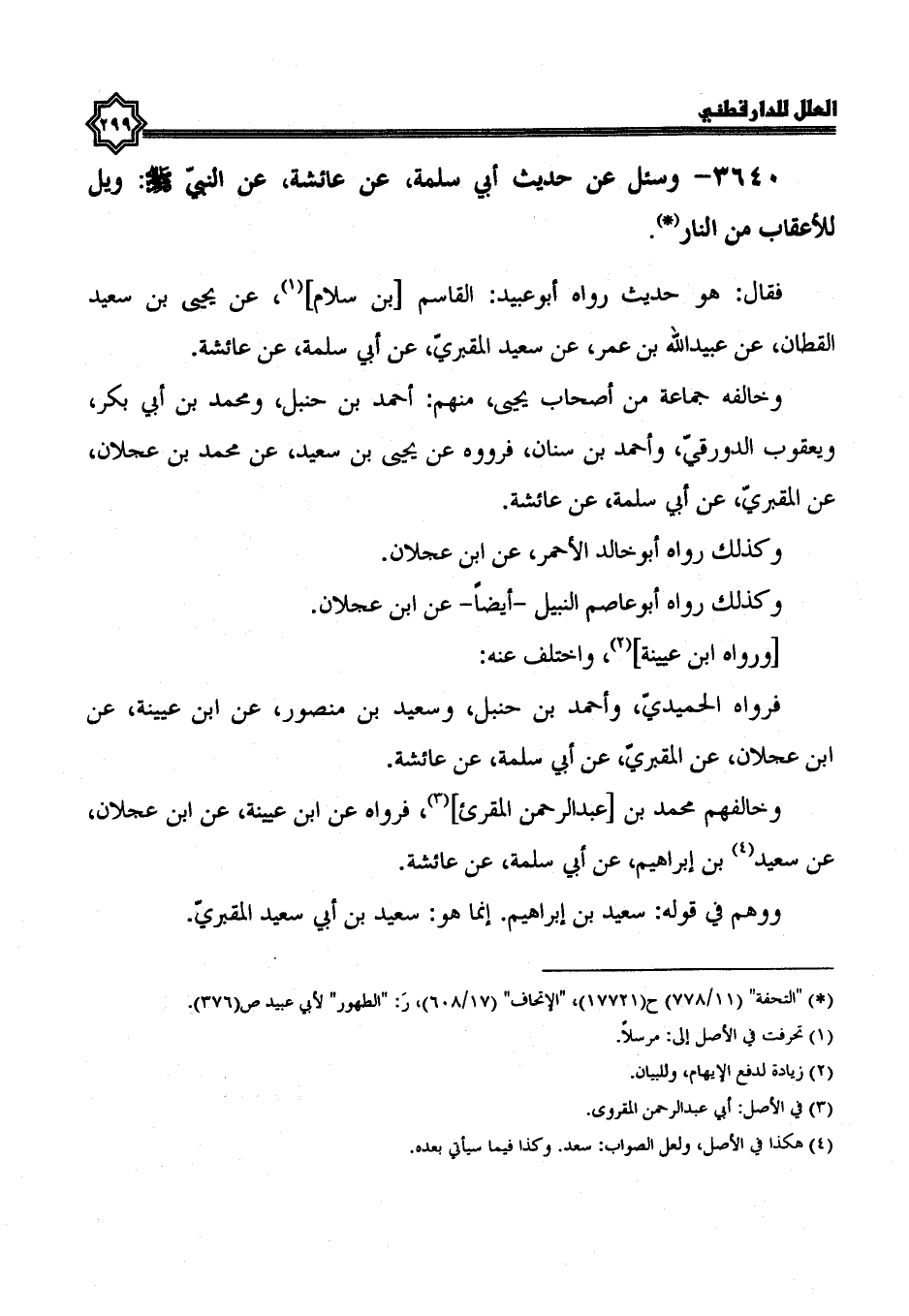 3640- وسئل عن حديث أَبِي سَلَمَةَ، عَنْ عَائِشَةَ، عَنِ النَّبِيِّ صَلَّى اللَّهُ عَلَيْهِ وَسَلَّمَ: وَيْلٌ لِلْأَعْقَابِ مِنَ النَّارِ فقال: هو حديث رواه أبو عبيد القاسم بن سلام، عن يَحْيَى بْنُ سَعِيدٍ الْقَطَّانُ، عَنْ عُبَيْدِ اللَّهِ بن عمر، عن سعيد المقبري، عن أبي سلمة، عن عائشة.