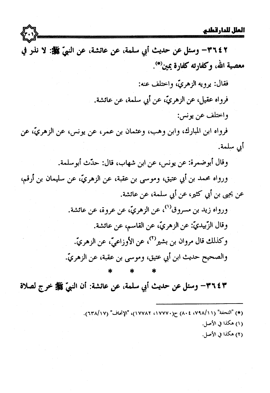 3642- وسئل عن حديث أَبِي سَلَمَةَ، عَنْ عَائِشَةَ، عَنِ النَّبِيِّ صَلَّى اللَّهُ عَلَيْهِ وسلم: لا نذر في معصية الله، وكفارته كفارة يمين.